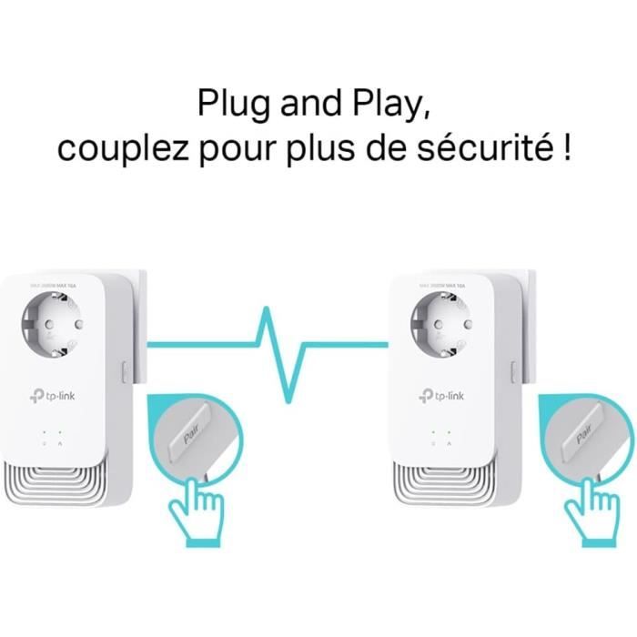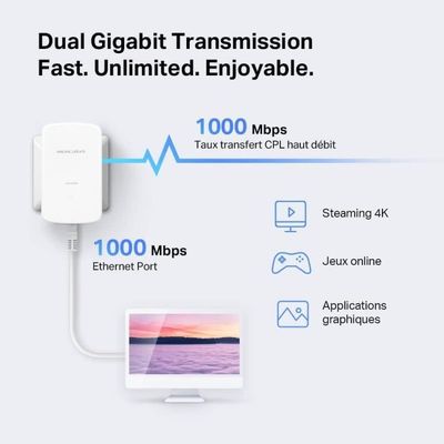 Extensible et sécurisé – Faites évoluer votre réseau Powerline en ajoutant d'autres adaptateurs compatibles et bénéficiez du chiffrement AES 128‑bit Mercusys CPL WiFi N 300Mbps + CPL 1000 Mbps Adapteur, Boitier CPL WIFI Avec 1 Port Gigabit Et Prise Integree Prise Cpl Wifi Kit De 2 Ideale Pour Profiter Du Service Multi Tv Jeux Video Mp510 Kit Le Mercusys MP500P KIT est un excellent choix pour améliorer la couverture réseau à la maison. L’installation est très simple et rapide, même pour les personnes qui ne sont pas expertes en informatique Débit jusqu’à 1000 Mbps sur votre réseau électrique – Grâce au standard HomePlug AV2 pour une connexion puissante et fiable Parfait pour le streaming 4K, les jeux en ligne et les connexions stables sans percer de murs. Ce kit Powerline AV1000 utilise votre installation électrique pour transmettre un signal Internet gigabit jusqu’à 300 m. Parfait pour le streaming 4K, les jeux en ligne et les connexions stables sans percer de murs Installation simplissime – Branchez, appuyez sur “Pair” et profitez : zéro paramétrage requis Éliminez les zones mortes Wi‑Fi grâce au MP500P KIT. Kit Cpl 1000mbps Mercusys Cpl 1000Mbps Avec 2 Port Gigabit Et Prise Intégrée, Boitier Cpl Kit De CPL Plug-and-play Compatible Box