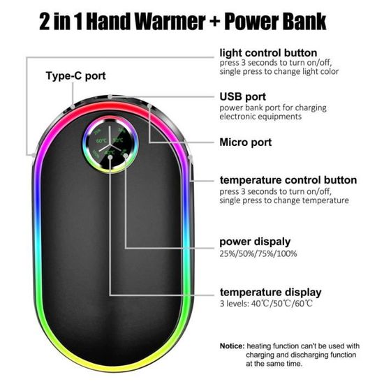 Amdohai Banque d'Alimentation Portable 10000mAh Chauffe-Mains Rechargeable avec Port Type-C Chauffe-Mains Électrique & Chargeur de Téléphone pour Voyage d'Avant-garde en Plein Air Camping Urgence Banque d'Alimentation Confortable et élégant : la coque et la forme du chauffe-mains rechargeable FANDLISS ont été conçues et modifiées de nombreuses fois pour vous fournir la prise en main la plus confortable et la température de surface la plus appropriée Petit et portable, bon choix pour les cadeaux] Forme compacte et portable, design moderne et simple, emballage exquis, une variété de couleurs au choix. Les jeunes femmes adorent ces chauffe-mains chauds, qui sont le meilleur cadeau pour Noël, Halloween, l'Action de grâce et le Nouvel An Chauffe-Mains Rechargeables,2 Packs,10000mAh Chauffe Mains électriques USB Portable,avec Lumières de Secours,l'Extérieur,Camping, Chasse,Cadeaux Hiver,Thérapie Thermique idéale Chauffe-Mains Électriques, Chauffe-Mains À Coussin Chauffant Usb Avec