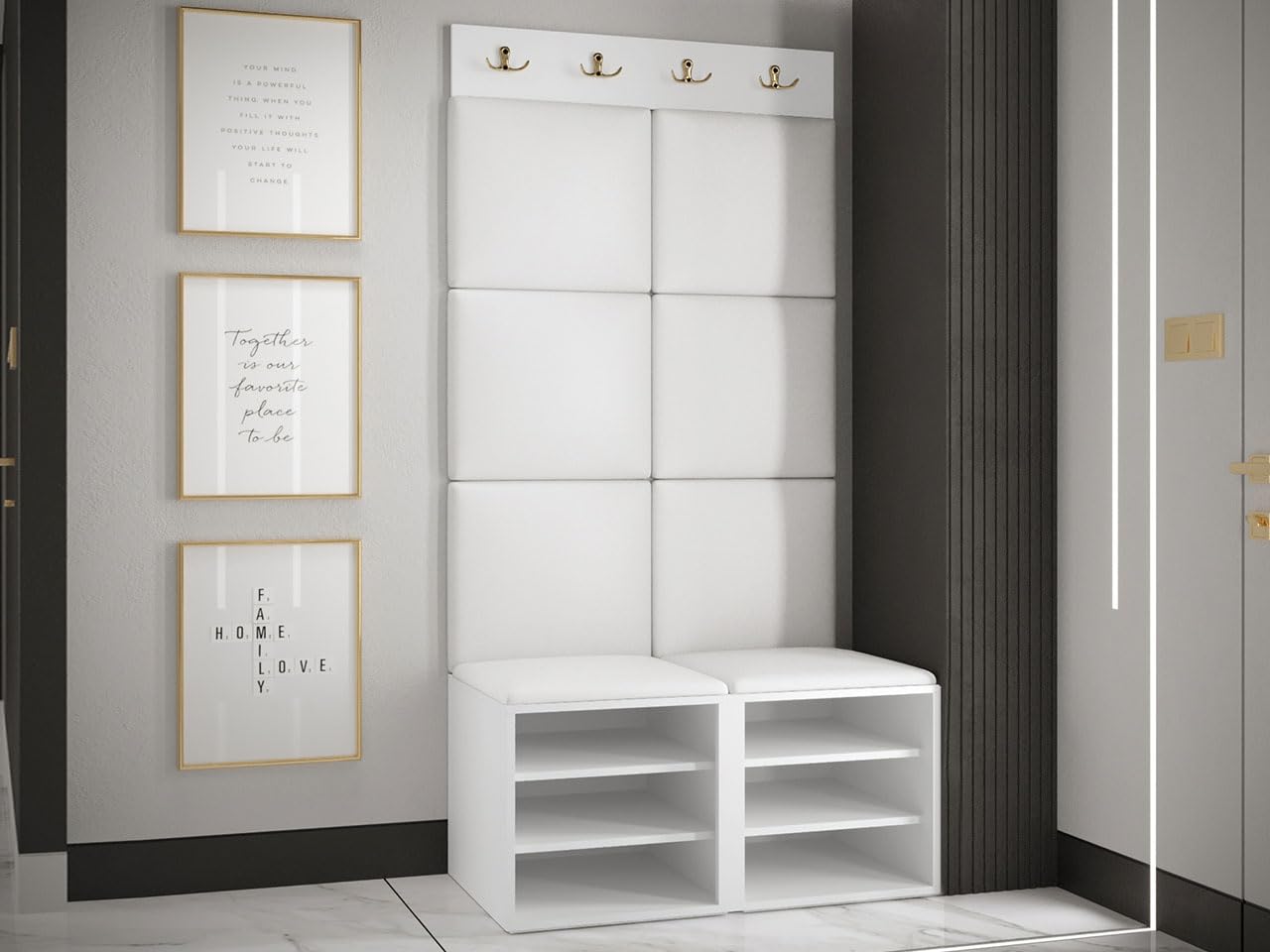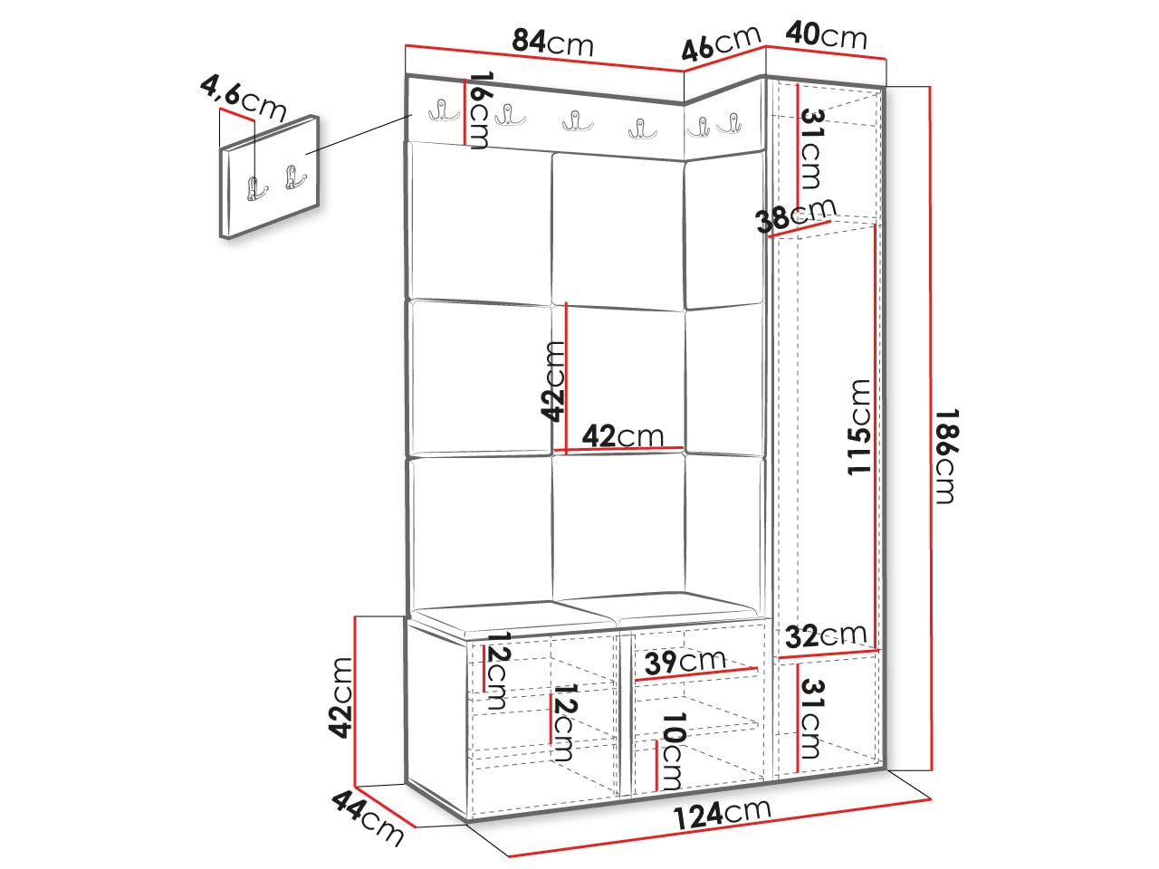 - Planche à patère 84 : largeur 84 cm, hauteur 16 cm, profondeur 4,6 cm. - Meuble à chaussures 2D : largeur 84 cm, hauteur 42 cm, profondeur 46 cm. Contient 8 crochets doubles pour vêtements Les meubles sont livrés dans des paquets avec instructions de montage (français non garanti) jusqu'à la première porte. - Détails du panneau d'assise rembourré/panneau mural : * Matériau : la base est en plaque + mousse + tissu * Méthode de montage : avec colle (les accessoires ne sont pas inclus dans le prix. Armoire à chaussures Valérie Ensemble Porte-manteau Avec Banc à Chaussures Largeur De 82 Cm Blanc M24176201 Kirtan Slim IX Ensemble vestiaire Notre transporteur n'offre pas de service d'assemblage Ensemble de panneaux de siège rembourrés Informations supplémentaires : - Sans décoration. Porte-manteau Couloir Blanc Mirjan24 Kirtan Slim IX, Armoire à Chaussures Avec 6 Portemanteau Couloir Design Moderne Mirjan24 Kirtan Slim IX, Armoire à chaussures avec 6 compartiments planche à crochets, panneau rembourré/panneau mural, 4 crochets doubles, porte-manteau mural (noir, manille 23 * Protège le mur contre les dommages. Dimensions : - Armoire 1D : largeur 40 cm, hauteur 186 cm, profondeur 46 cm. * Isolent le mur contre le son., * Utilisation : intérieur. Ensemble de jardin Kirtan Slim Ix. - Panneau mural rembourré Samit 42 x 42 : largeur 42 cm, hauteur 42 cm, profondeur 4 cm (11 pièces) - Les dimensions exactes se trouvent dans la galerie d'images dans le dessin technique - Toutes les dimensions sont d'environ Dimensions : Combinaison de couleurs : - Les couleurs de nos graphiques peuvent différer de l'original. Les meubles sont livrés dans des paquets avec des instructions de montage à monter soi-même jusqu'à la première porte.