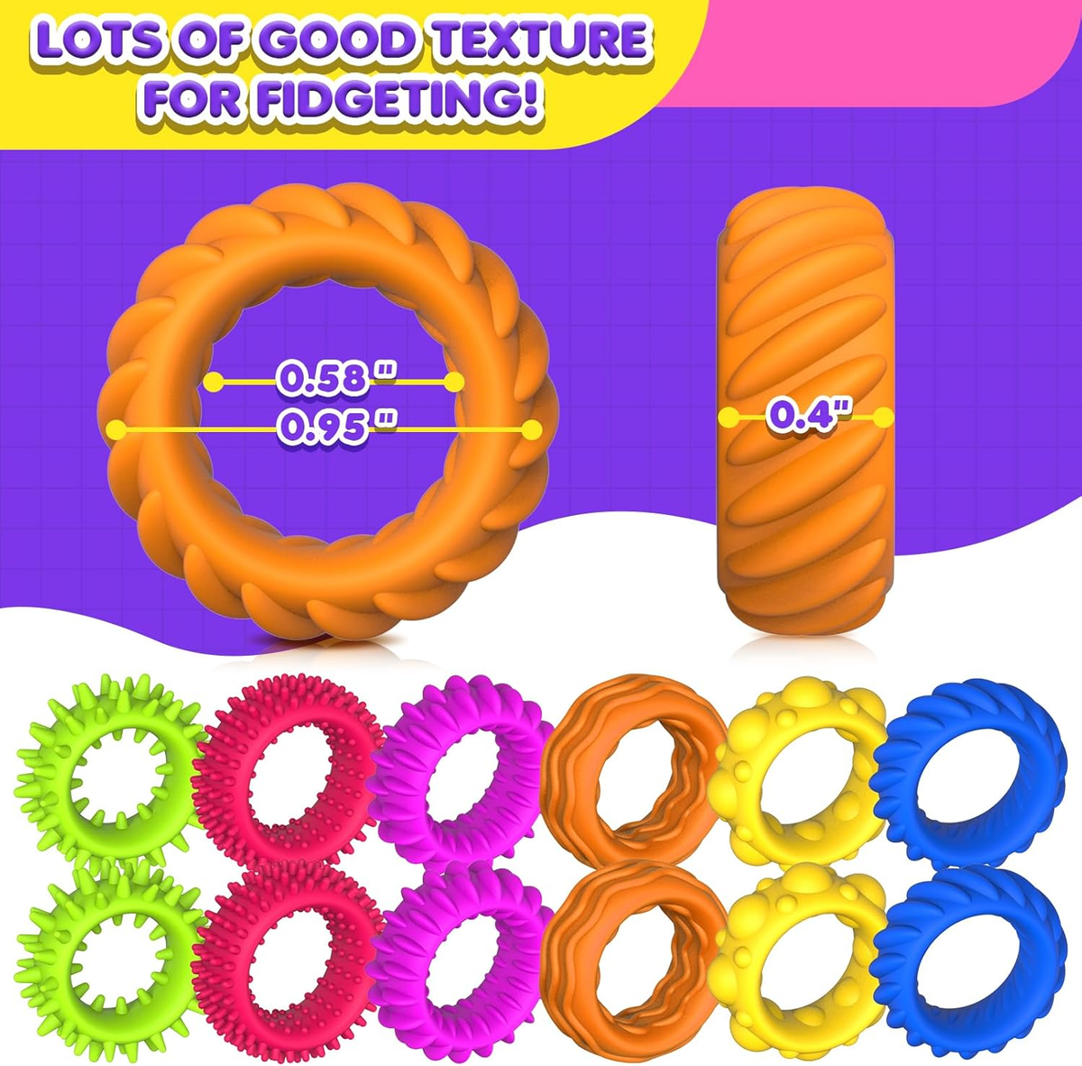 Les Anneaux Sensoriels en Silicone aux couleurs vives favorisent la concentration et la tranquillité d'esprit de manière ludique. DIVERTISSEMENT SANS FIN] : Ces jouets anti-stress pour enfants présentent des textures uniques, des couleurs vives et des matériaux extensibles pour des heures de plaisir. Les anneaux sensoriels de 12 pièces sont le cadeau de fête parfait pour les enfants de 3 à 5 ans et de 4 à 8 ans 🎁 Vous recevrez 12 morceaux de bagues sensorielles fidget en 6 couleurs,suffisamment de quantité pour répondre à vos besoins d'utilisation et de partage. Pour les enfants autistes, c'est un mini-jouet parfait pour obtenir un sentiment de confort et de calme, offrir un divertissement tranquille aux jeunes enfants et leur procurer un plaisir tactile sans fin. ✅【Cadeau Idéal】 Le set de anneaux sensoriels en silicone est un excellent cadeau sensoriel, un cadeau d'anniversaire, un cadeau à glisser dans un sac cadeau, un jouet à mettre dans une boîte de récompenses pour la classe, un cadeau pour une fête foraine ou un adorable jouet à emporter en voyage. Toucher différentes textures peut apporter différents sentiments. ✅【Idéal pour de nombreux besoins】Les anneaux sensoriels anti-stress sont d'excellents adultes, mais particulièrement utiles pour les personnes souffrant de troubles de l'attention, de troubles obsessionnels compulsifs, de besoins spéciaux ou d'anxiété élevée. Jouets Montessori Bébé 18 Mois, Jouets Sensoriels pour 1 an Jouets à... 🎁 Ces jouets à presser pour élèves sont parfaits pour bouger les mains pendant les moments stressants lorsque vos enfants apprennent ou lisent. Fidgets For School 6/12/18PCS Sensory Rings Fidget Toys Autism Calming Stress Relief Finger Rings Set Children Gifts Student Classroom Prize Fidget Rings For Kids Anneaux Silicone étirables 12 Pièces Silicone Jouets Sensoriels Ring, 12 Pièces Bagues Fidge-t En Tdah Enfant Outils ✅【Jouets sensoriels anti-stress pour enfants】Ce lot comprend 12 anneaux fidget toy en silicone, disponibles en six couleurs, deux de chaque. 🎁 La boucle sensorielle élastique est idéale pour les enfants atteints de TDAH ou d'autisme qui veulent améliorer leur concentration. ✅【Matériau de haute qualité】Le bord de chaque Silicone Jouets Sensoriels Ring est fabriqué en silicone souple et lisse, sûr, confortable et durable. Contrairement aux Fidget Sensoriels Rings classiques, il reste ferme même après des étirements répétés, évitant ainsi toute déformation. ✅【Relaxation multi-sensorielle】Nos Anneaux Sensoriels en Silicone pour Enfants répondent à tous les besoins sensoriels en roulant, en appuyant et en ressentant les différentes structures de surface.