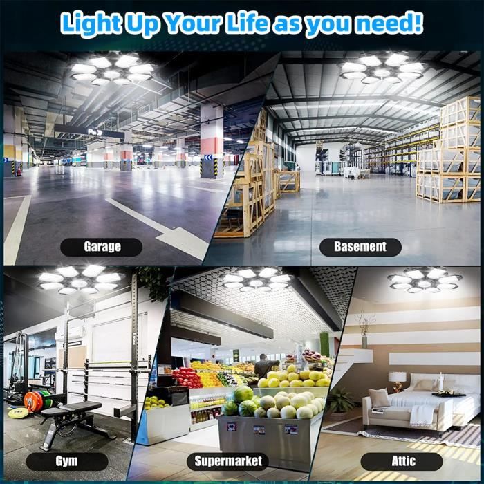 Illuminez votre garage comme en plein jour : Vous avez besoin de luminosité ? Cette lampe de garage fournit 15 000 lumens de lumière pure et vive, comme si vous sortiez en plein jour. Lampe de garage avec détecteur de mouvement et 6 panneaux déformables Ce luminaire de garage LED délivre 15000 lm avec une température de couleur de 6500K, imitant la lumière du jour. Avec un IRC ≥80, il assure un rendu des couleurs réaliste Avec une température de couleur de 6 500 K et un IRC ≥ 80, les couleurs et la brillance de votre voiture ressortiront et vous repérerez facilement ces panneaux d'avertissement importants, ce qui vous permettra de garder les choses en sécurité. Conçu pour durer par tous les temps : Avec une durée de vie de plus de 50 000 heures, cette lampe ne va nulle part. Il suffit de la visser et c'est terminé, pas de câblage, pas de souci. Plafonnier LED E27 6500K VEVOR Lampes De Garage LED, Lot De 2, Plafonnier D'Atelier Lampe E27 Garage Couverture à 360 degrés, pas de coins sombres : Cette lampe est livrée avec 6 panneaux réglables, vous permettant de diriger la lumière exactement là où vous en avez besoin. Elle est suffisamment robuste pour supporter les hivers les plus froids et les étés les plus chauds (-20 ℃ à 50 ℃). Installation rapide et facile : Vous avez une douille E26/E27 ? Super, car c'est tout ce dont vous avez besoin. Détection de mouvement intelligente : Grâce à un capteur de mouvement infrarouge précis, cette lumière sait quand vous êtes là. IY24825-LED Éclairage de garage - lampe d'atelier déformable intérieur La portée ? Environ 3 à 3,6 mètres. PLAFONNIER 200W Eclairage LED Garage,20000LM 6500K Lampe d'atelier...