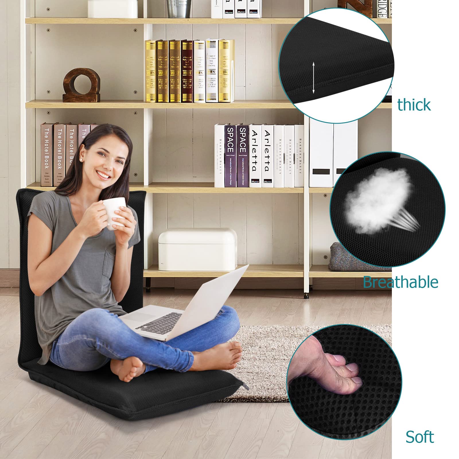 Méditez ou détendez-vous en position verticale sans vous soucier des maux de dos. 6 positions réglables pour la polyvalence : cette chaise de sol dispose d'une technologie de verrouillage métallique unique qui vous permet de régler facilement le dossier dans 6 positions différentes. Attris : réglage sur 6 positions et pivotement à 360 degrés :le fauteuil de sol est conçu avec un dossier réglable sur 6 positions pour satisfaire aux différentes exigences individuelles. Il est facile de régler le dossier à l'angle désiré, il vous suffit d'exercer une pression du corps Chaise Longue Réglable Fauteuil Relax de Sol Matelas Pliant, Canapé Paresseux avec Pouf... Housse amovible pour un nettoyage facile : cette chaise de style japonais dispose d'une base en nylon facile à nettoyer. bonVIVO Easy II Fauteuil de Sol Rembourré pour Adultes et Enfants avec La housse entièrement amovible en lin respirant est lavable en machine et assure un entretien élégant et sans effort. Parfait pour les réunions décontractées ou comme siège supplémentaire pour les invités. Chaise De Sol Pliable Fauteuil De Sol Avec Dossier Inclinable Réglable Sur 5 Niveaux, Cadre Chaise De Meditation Design pliable et portable : le fauteuil de salon pliable est incroyablement flexible et peut être facilement plié en deux ou posé à plat. Dimensions de l'emballage : 83 x 41 x 7,5 cm., Poids : 2,5 kg. Contenu de l'emballage : 1 fauteuil pliable avec coussin.