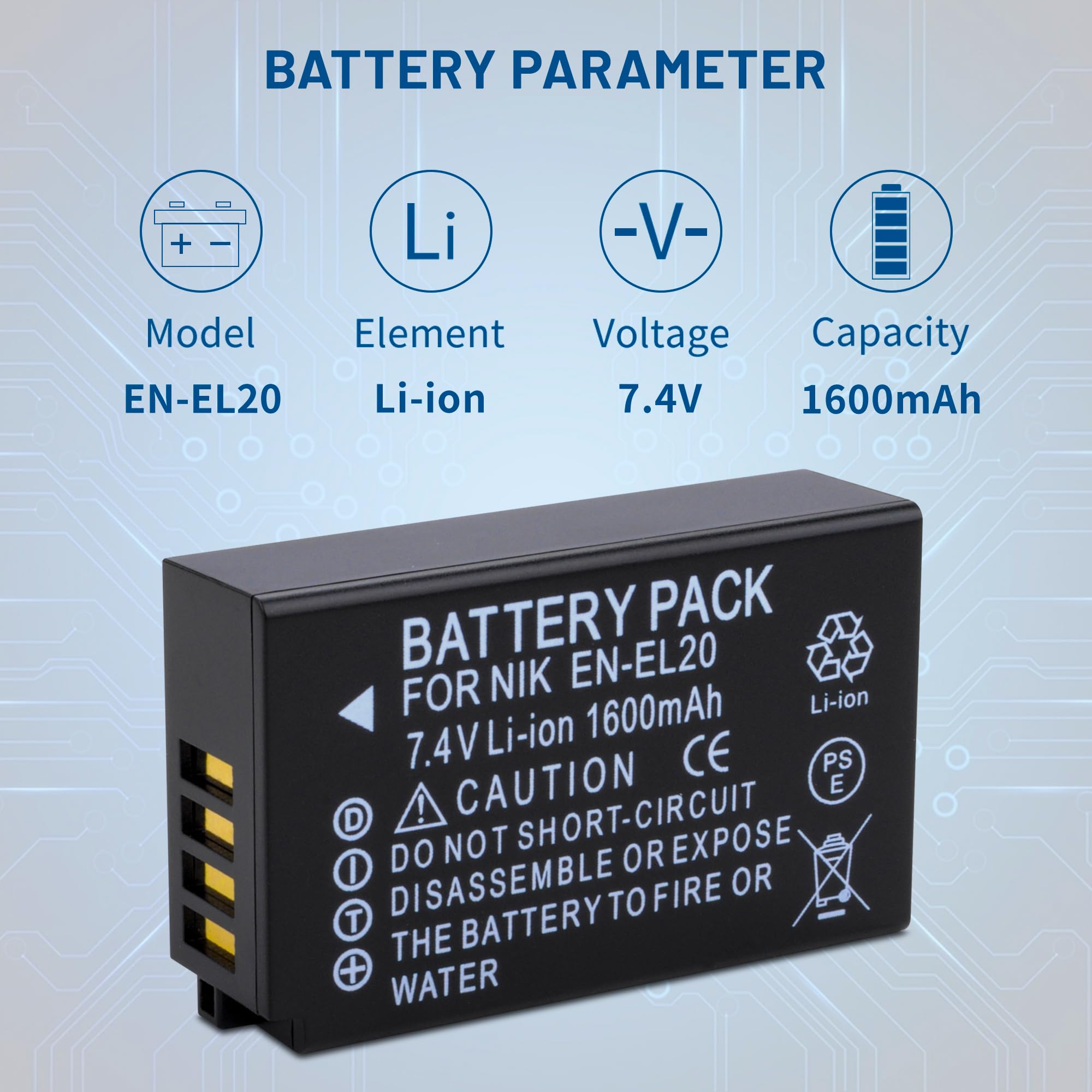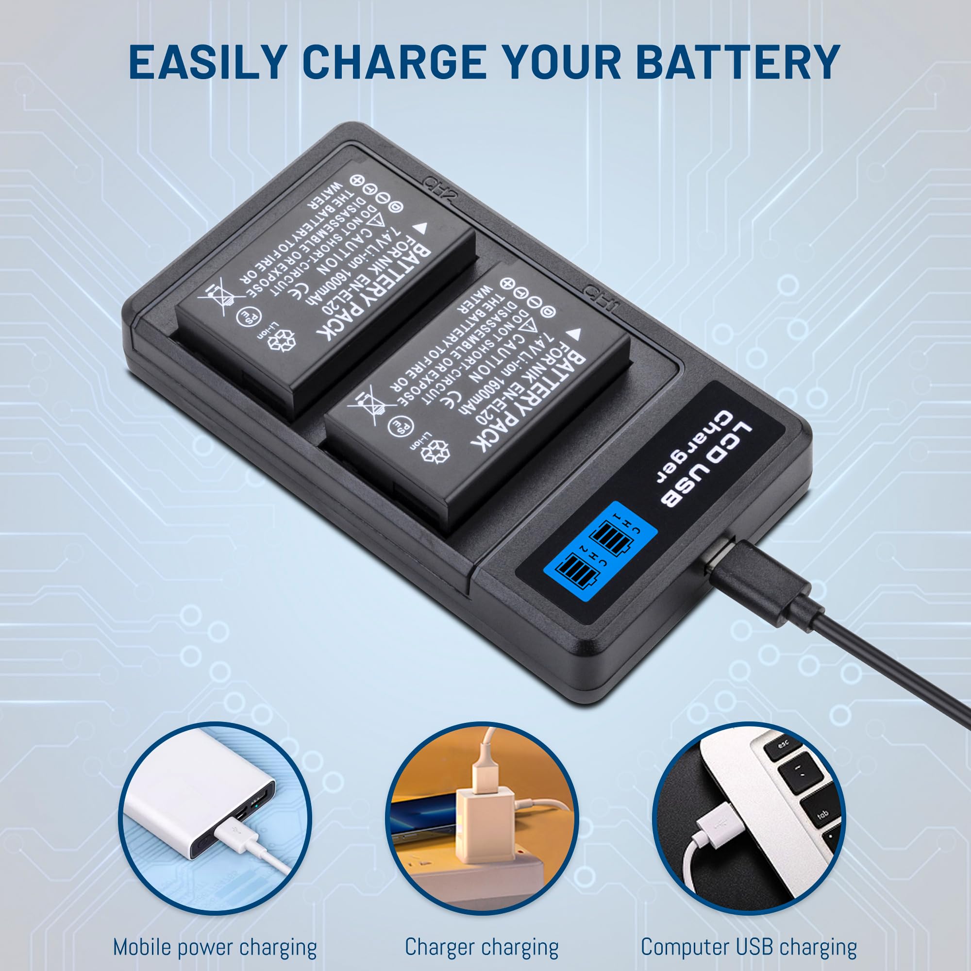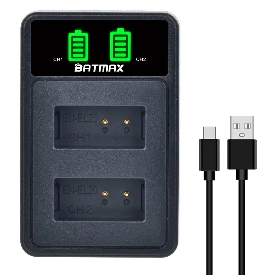 Cette batterie légère et compacte pour l'accessoire nikon coolpix p950 s'adapte dans votre poche et est donc facile à transporter même en voyage. Il prend en charge différentes méthodes de charge, compatible avec les ordinateurs portables, les chargeurs portables, les prises USB auto et les chargeurs muraux. 【Comme la batterie d'origine】Les batteries complètement décodées ont les spécifications exactes de l'original, mais avec une capacité plus élevée, durent plus longtemps et enregistrent des moments merveilleux. Pickle Power EN-EL20 EN-EL20a Batterie et chargeur compatible pour 【Fonction de protection multiples】La batterie est composée de cellules de haute qualité avec protection multiple intégrée (protection contre les surtensions, les surcourants, les courts circuits, les surtempératures et les surcharges), et la structure résistante au feu de haute qualité assure une sécurité de 100% lors de l'utilisation normale. Batterie et chargeur Hisewen EN-EL20 entièrement compatibles avec Nikon Coolpix P1000, P950, 1 AW1, 1 J1, 1 J2, 1 J3, 1 S1, 1 V3, DL24-500, Coolpix A.Le chargeur USB double LED Hisewen EN-EL20 dispose de 2 emplacements pour batterie Canon Batterie Usb-c P1000 Batterie EN-EL20 Et Chargeur Pour Nikon 1 J1 J2 - Batterie Pour Nikon Coolpix Cette nouvelle batterie est composée de cellules de premier choix et est compatible à 100% avec la batterie d’origine. Offre spéciale ! Pour tout achat simultané d’une batterie EN-EL20 pour appareil photo Nikon chargeur vous bénéficiez d’une remise immédiate de 5