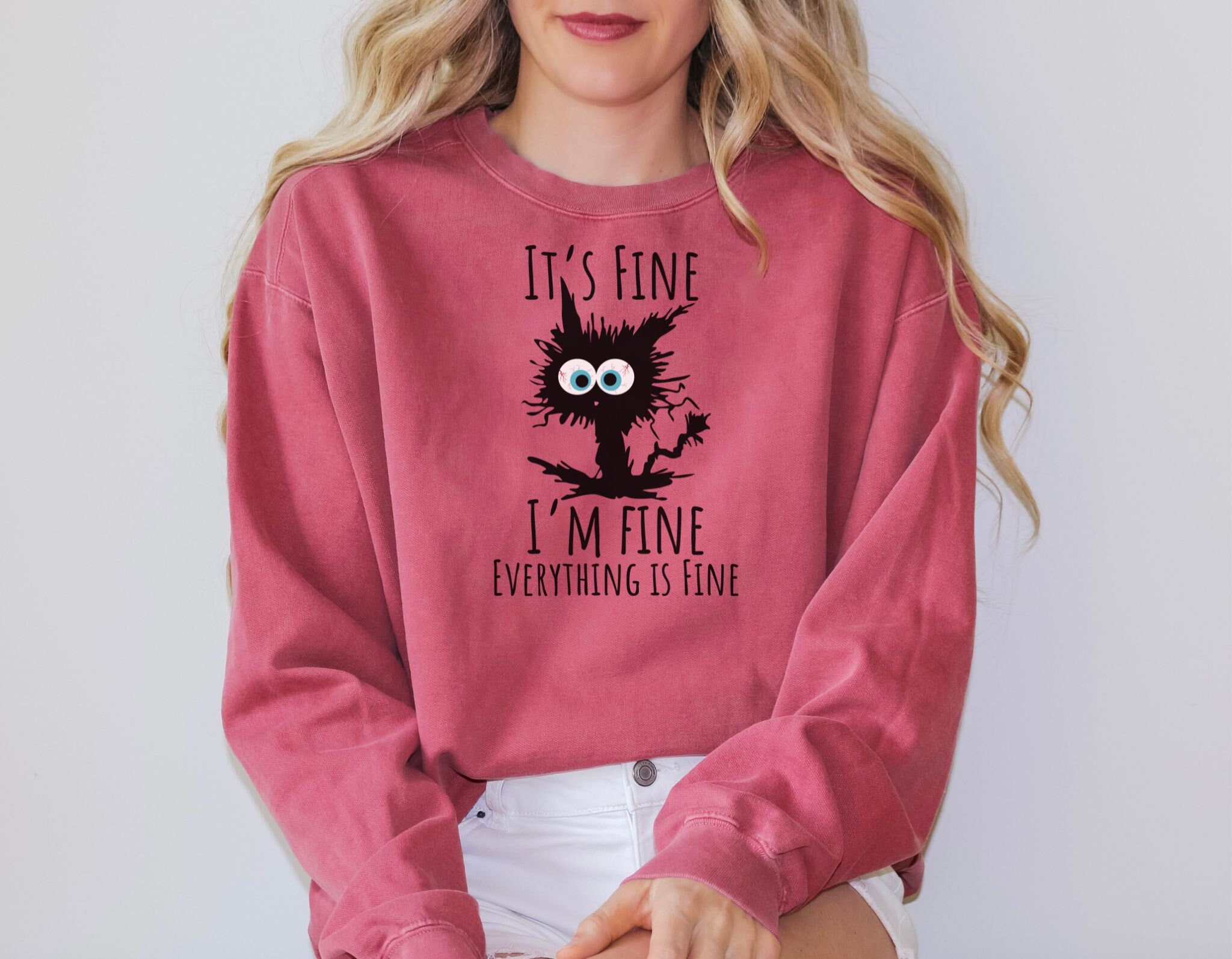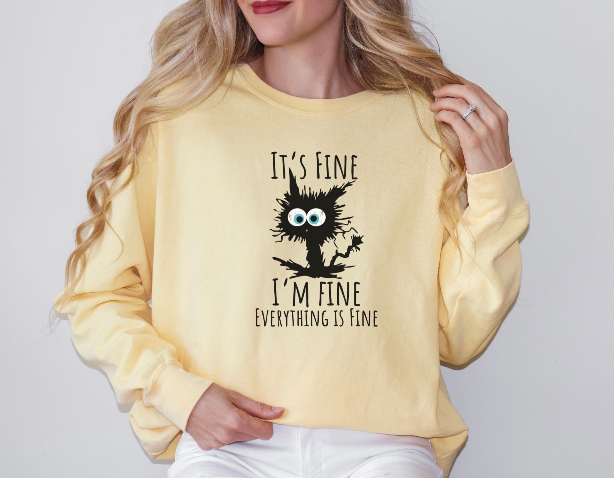 Motif assorti : le dicton est souligné par un dessin d'un chat noir qui semble tout sauf « fin » avec une fourrure pailletée et des yeux larges déchirés Humour sarcastique : le sweat-shirt confronte la folie du quotidien avec l'inscription « it's fine, i'm fine, everything is fine » (c'est bien, je vais bien, tout va bien) Haute valeur reconnaissable : une façon humoristique de gérer le stress et un t-shirt dans lequel beaucoup se retrouveront certains jours Stressé Femme En Dessin Animé Avec Bulle De Dialogue Vecteurs libres de Coupe confortable : un sweat-shirt classique à col rond dans une coupe décontractée, idéal pour les jours où vous voulez vous sentir à l'aise Tshirt noir femme chic en crêpe de laine Made in France Haut Décontracté Col Rond Confortable WFIAOUESS Sweat-shirt De Noël Avec Inscription « It's Fine I'm Fine Sweat-shirt Humour Femme pull femme en maille fine avec double col v borde de dentelle kaki...