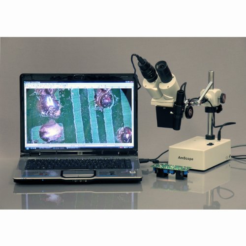 Un tube oculaire dispose d'un correcteur de dioptrie intégré pour les utilisateurs souffrant d'astigmatisme ou pour affiner la mise au point lors de l'utilisation d'un appareil photo au lieu d'un oculaire. Microscope Professionnel Oculaires Grand Champ AmScope - 10X-20X Stereo Zoom Microscope, Binocular Viewing Head éclairage LED Col De Cygne Livré avec une tête binoculaire, des oculaires grand champ, un support de bras et une lumière LED col de cygne. La tête peut être ajustée pour tout utilisateur en utilisant le réglage binoculaire rotatif pour assurer un bon alignement avec les yeux. Longue distance de travail de 22,9 cm. Divers oculaires sont disponibles pour élargir la gamme de grossissements. Le support de bras vous permet de faire pivoter la tête du microscope autour de deux axes différents (X et Z). Éclairage LED flexible en forme de col de cygne. La tête d'observation utilise des tubes oculaires de 30,5 mm pour fournir un champ de vision extra-large. Tubes oculaires inclinés à 45 degrés et protections oculaires en caoutchouc pour une observation facile. Cette gamme est destinée à la soudure courante et à la réparation mécanique et l'inspection d'objets plus grands. 2 paires d'oculaires grand champ. AmScope SE400-Z Professional Binocular Stereo Microscope, WF10x and WF20x Eyepieces, 10X and 20X Magnification, 1X Objective, LED Lighting, Boom-Arm Stand, 110V-120V - Nombre de estilo Microscope | Guatemala Ce microscope est parfait pour la réparation de PCB, la soudure et les applications dentaires.
