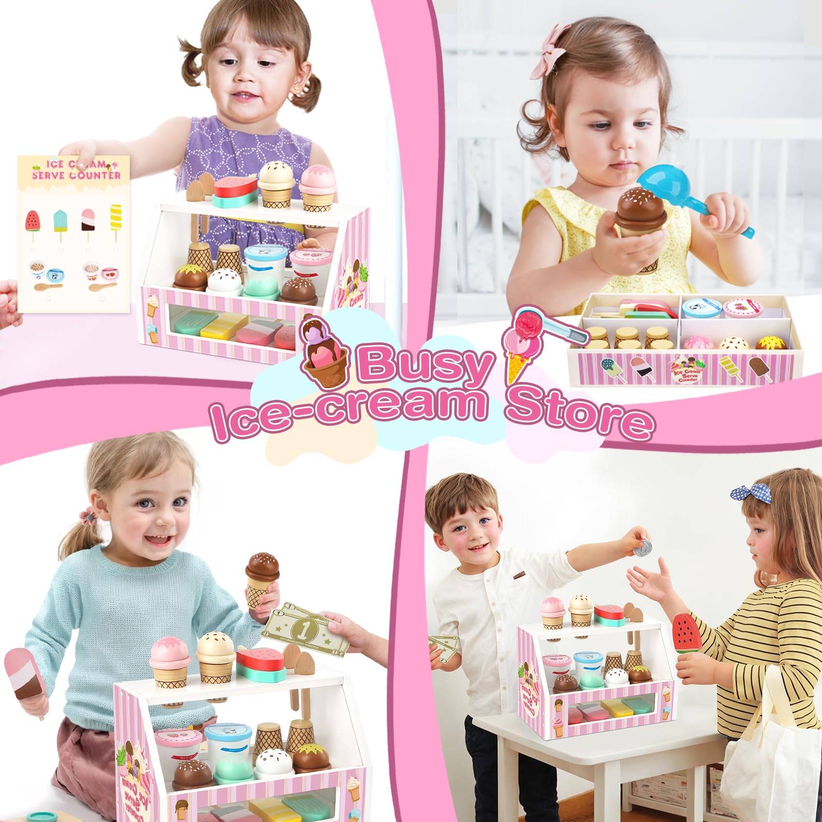 Les pièces en bois sont peintes avec des peintures non toxiques et aux bords lisses. Livré prêt à jouer dans une jolie boîte cadeau, c'est le présent idéal pour les anniversaires, Noël, ou pour stimuler le jeu créatif des 3-6 ans. Des heures d'amusement en perspective Les bords arrondis et lisses garantissent une sécurité totale pour les enfants. Dinette Enfant Dinette En Bois,,Legumes Jouet Avec Panier,Accessoire Cuisine Enfant,Jouet Bois Machine A Cafe Jouet Glace pour enfants : Cet ensemble créatif comprend tout ce dont les petits glaciers ont besoin – 1 x chariot de glace enfant, 2 x coupes de glace, 4 x boules de glace, 6 x garnitures colorées, 6 x glaces sur bâtonnet, 4 x cornets de glace, 1 x cuillère à glace, de l'argent factice et 1 x menu. Cadeau parfait pour les enfants créatifs : Cet ensemble accessoire cuisine enfant est un cadeau idéal pour les anniversaires, Noël ou d'autres occasions spéciales. Convient aux enfants de 3 à 8 ans qui adorent inventer des histoires et jouer à des jeux d’imitation ! Les enfants adorent imiter les grands – avec ce glacier en bois Atoylink, ils vont s'éclater ! Ce set complet de 32 pièces comprend un comptoir, des cornets, des boules de glace velcro, des garnitures, des billets, une carte de crédit et même un tablier Jouet Créatif 3 4 5 6 Ans Glacier Jouet Enfant Atoylink - Bois, 28 De plus, le chariot offre un espace de rangement pratique à sa base, où tous les accessoires cuisine enfant peuvent être rangés après le jeu – parfait pour garder tout en ordre et rendre le jeu encore plus amusant ! Ce dinette enfant réaliste encourage la créativité, développe les compétences sociales et offre aux enfants une expérience ludique valorisante. Chariot de glace mobile en bois : Le charmant jouet en bois permet aux enfants de pousser leur chariot et de vendre leurs glaces partout, comme dans une vraie boutique de glaces.