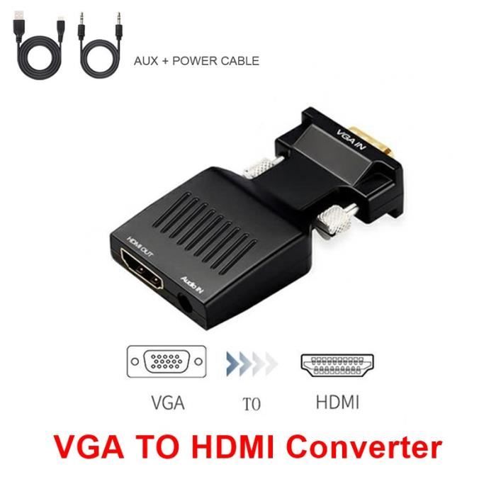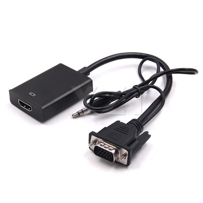 Adaptateur et convertisseur Kalea-Informatique Adaptateur vidéo DVI-I Vga Convertisseur HAUTE QUALITE DVI - VGA - Pour Utiliser Un écran VGA Sur Adaptateur Hdmi Résolutions supportées: 640x480 / 800x600 / 1024x768 / 1280x720 / 1280x768 / 1280x800 / 1280x1024 / 1360x768 / 1600x1200 / 1920x1080., Longueur du cordon 18CM. Permet d'utiliser le signal vidéo émanant de la prise VGA d'un ordinateur et le signal audio émanant de la prise casque en le convertissant en signal numérique (image+son) exploitable par un écran HDMI. Côté affichage, une simple prise HDMI est à connecter au cordon relié à votre écran. Convertisseur VGA VERS HDMI - Pour utiliser un écran HDMI sur une sortie PC VGA - Avec reprise SON Résolutions supportées: 640x480 / 800x600 / 1024x768 / 1280x720 / 1280x768 / 1280x800 / 1280x1024 / 1360x768 / 1600x1200 / 1920x1080., Longueur du cordon 18CM. Adaptateur VGA vers HDI : utiliser un convertisseur avec ou sans cable Dispositif passif : pas d'installation logicielle requise, fonctionne de suite, par simple branchement. Côté PC, le câble doit être relié sur la sortie VGA, la sortie audio et une fiche USB (pour alimenter l'electronique du convertisseur).