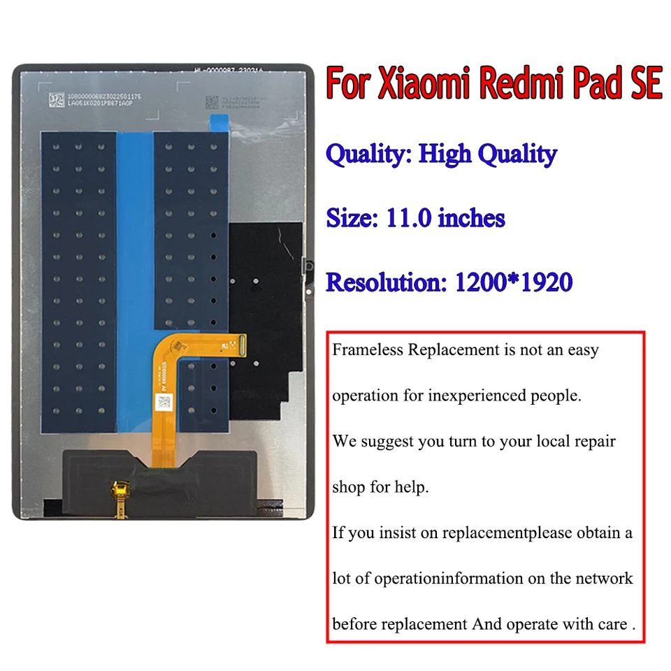 Avant l'installation, veuillez vérifier si chaque pièce de rechange est intacte. Nous fournissons une garantie à long terme et un service après-vente professionnel pour le remplacement de l'écran., 3., Vous pouvez rechercher « Remplacement d'écran des modèles associés » sur YouTube pour une vidéo d'instructions sur la façon d'effectuer le remplacement. Si vous rencontrez un problème lors de l'installation ou de l'utilisation, n'hésitez pas à nous contacter., 4., Chaque écran est livré avec un ensemble d'outils et un adhésif de rechange. Kit Remplacement écran Tablette Xiaomi Xiaomi Redmi Pad SE 11 Inches LCD Touch Screen Assembly Pièce Rechange Redmi Pad SE Écran LCD de remplacement avec vitre tactile conçu pour Xiaomi Redmi Pad SE. Un kit de remplacement à utiliser si votre écran anti-inondation est rayé, fissuré ou autrement endommagé. L'ensemble comprend un écran LCD et une vitre tactile. Pièces de rechange de rechange Écran de remplacement pour Xiaomi Redmi Pad SE 11 pouces. Haute qualité, tactile précis, compatible avec le modèle 2023 Toutes les spécifications et fonctionnalités de RED Pad SE | Xiao