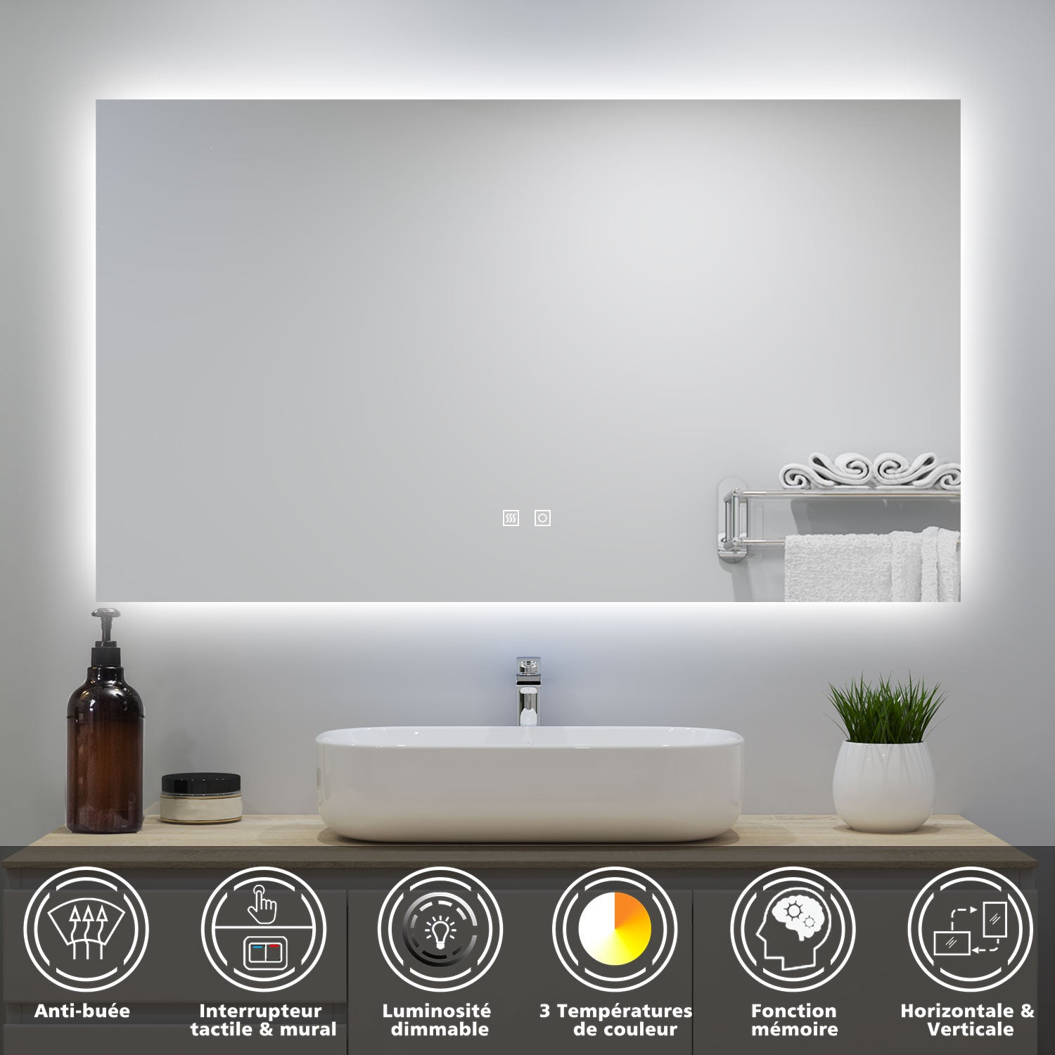 EXPEDITION SECURISEE:Chaque miroir est emballé en toute sécurité dans une boîte renforcée de haute qualité, et couvert par un film en plastique réduisant tout risque d’endommagement pendant le transport. STARLEAD Miroir Salle de Bain avec Éclairage 100x70cm, Miroir LED Salle de Bain Bluetooth, Dimmable, 3 Couleurs Légères, Anti buée, Mémoire, IP44, Verre Trempé HD, Horizontal/Vertical Fonction: Bluetooth simple:vous pouvez écouter de la musique sous la douche et profiter d'une expérience de bain extraordinaire. Fonction mémoire : lorsque vous éteignez puis rallumez le miroir, l'éclairage reste réglé comme avant l'extinction. Affichage de l'heure : le miroir est équipé d'une fonction d'affichage de l'heure, ce qui vous permet de connaître l'heure facilement, même lorsque vous prenez votre douche. Bluetooth:Miroir salle de bain bluetooth, connectez simplement votre smartphone à l'enceinte sans fil via Bluetooth et profitez de la musique dans la salle de bain. Double son surround stéréo à 360 degrés, Haut-parleurs doubles de haute qualité. Miroir salle de bain 120x70 : la sélection produits Leroy Merlin de ce jeudi au meilleur prix ! Retrouvez ci-après nos 363 offres, marques, références et promotions en stock prêtes à être livrées rapidement dans nos magasins les plus proches de chez vous Dimmable: La luminosité de la lumière peut être réglée en continu, de sorte que la luminosité de la lumière est ajustée en fonction des besoins de la scène, pour répondre aux besoins individuels et réaliser un contrôle plus précis de l'économie d'énergie. EMKE Miroir Lumineux Salle De Bain 120x70cm, Cadre Noir, Miroir LED Avec Interrupteur Tactile Anti Buee Horloge Et Temperature Lumiere Neutre Miroir De Salle De Bain LED Avec Bluetooth 140 X 80cm, Miroir Salle De Bain Led Avec Bluetooth 140 X 80cm Miroir Salle De Bain Avec Horloge 3 Couleurs Dimmable Anti Buee Miroir Avec Interrupteur Tactile Ip44 3 Couleurs de Température: Il dispose de 3 températures de couleur réglables (2700K - warm blanc, 5000K - blanc neutre, 6500K - blanc froid). 3 couleurs : Vous avez le choix entre trois couleurs de lumière(3000K; 4500K; 6000K) pour ajuster l’atmosphère qui vous met à l’aise. Anti-buée: Lorsqu'il pleut ou prend une douche, la fonction anti-buée peut rapidement éliminer la buée sur la surface du miroir, vous offrant une expérience parfaite. Fonction mémoire: Le miroir a une fonction mémoire. Lorsque l'alimentation est éteinte, lorsque la deuxième fois que vous l'utilisez, il reviendra au réglage précédent.