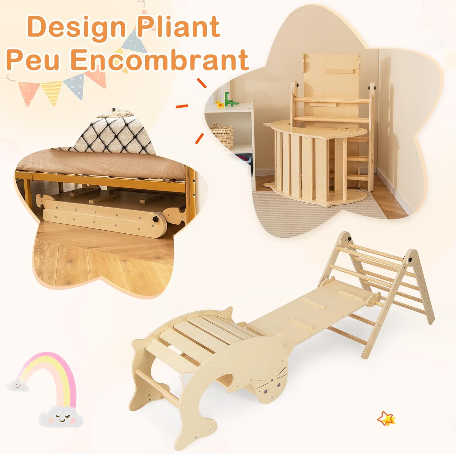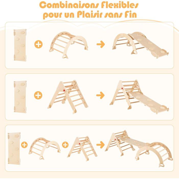 Bois de hêtre massif : Finition lisse et sans odeur, durable et sans risque d’échardes. Évolutif 3-en-1 : Conçu pour les enfants de 1 à 6 ans, avec trois hauteurs réglables pour s’adapter aux différentes étapes du développement – des premiers pas à l’escalade en confiance Jouet éducatif bonus : Train puzzle inclus, livré dans une boîte cadeau colorée exclusive, pour un apprentissage ludique supplémentaire Triangle Pikler 8 En 1 7 En 1 Triangle Arche Montessori D'Escalade Pour Enfants Avec Avec Toboggan Bois Rampe Échelle Réglable Multicoloré/Naturel Triangle Arc En Ciel 8 Activités Cette arche pliable en bois, adaptée aux enfants de 1 à 3 ans, offre un parcours de motricité à hauteur fixe, capable de supporter jusqu’à 80 kg. Sa conception intuitive favorise l’autonomie et l’épanouissement, tout en ajoutant une touche colorée et ludique à votre intérieur grâce à sa boîte cadeau arc-en-ciel Triangle d'escalade - Jeu d'Enfant Test du triangle d'escalade Montessori 8-en-1 Cosyland