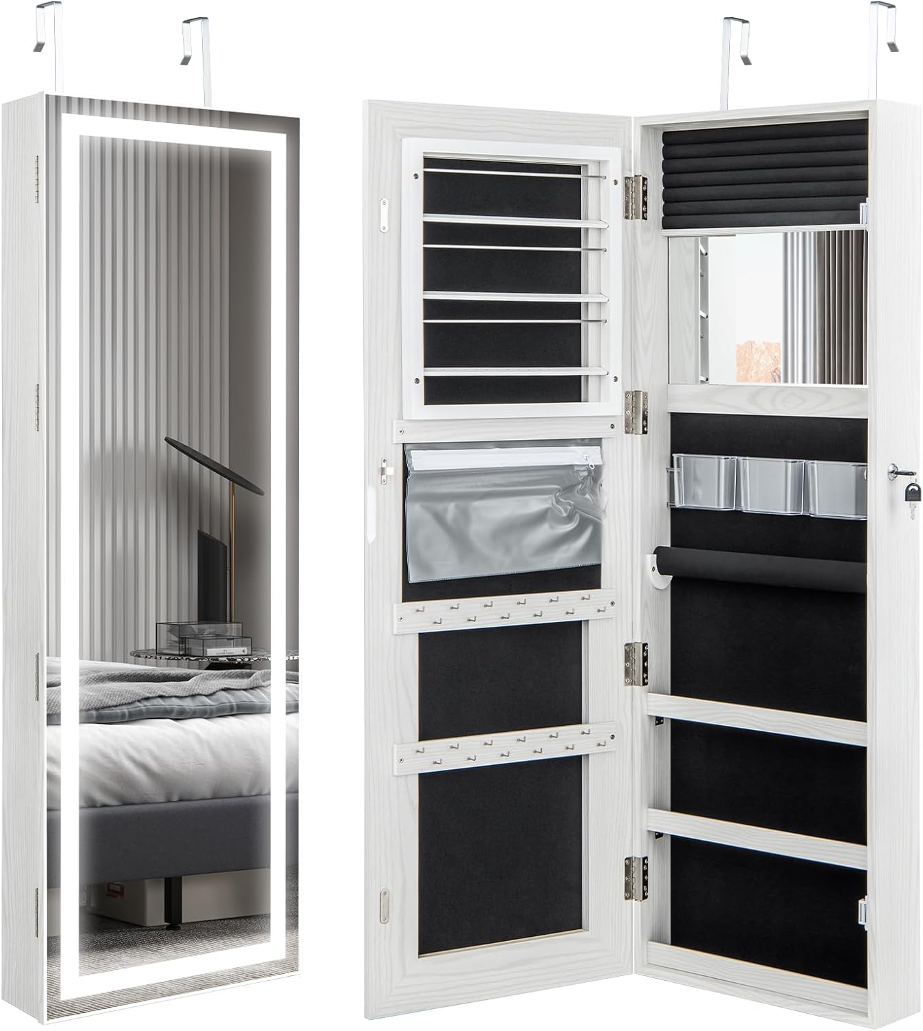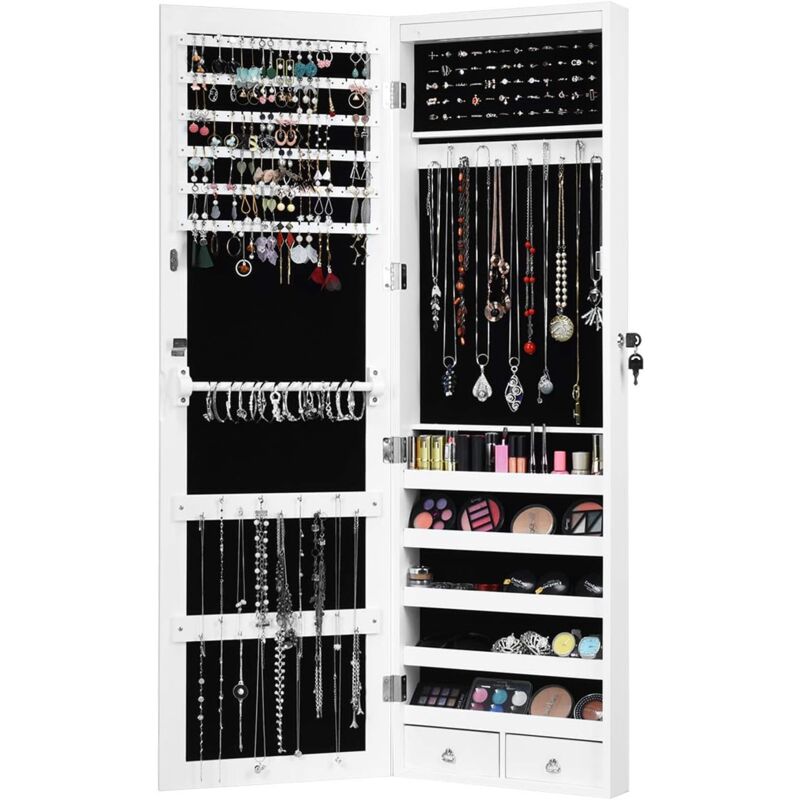 Admirez-vous dans un miroir sans cadre avec LED blanches, et un intérieur avec LED chaudes facilitant le maquillage. Gardez vos bijoux et parfums avec élégance grâce à cet armoire à bijoux avec miroir de HOMCOM. Son design suspendu économise de l'espace au sol, tout en offrant un large espace de rangement. Équipé de six LED internes pour un éclairage optimal, ce miroir combine parfaitement beauté et fonctionnalité Caractéristiques:● Miroir plein pied lumineux en blanc brillant de l'armoire à bijoux permet de vous admirer de la tête aux pieds ● Miroir intérieur éclairé de lumière chaude pour appliquer le maquillage sans effort ● Rangement caché pour organiser vos boucles d'oreilles, colliers, bagues, bracelets, rouge à lèvres, pinceaux, etc. MIROIR INTÉRIEUR ÉCLAIRÉ : Simplifiez votre routine beauté avec ce miroir interne lumineux offrant une lumière douce et chaleureuse, évitant ainsi de réveiller votre partenaire avec des lumières vives (fonctionne avec 6 piles AA, non fournies) ARTISANAT DE QUALITÉ : Conçue avec un cadre en MDF solide et une doublure en velours tendre, cette armoire à bijoux murale garantit une solidité extérieure et une protection douce à l'intérieur pour la sécurité de vos bijoux et accessoires précieux. Porte Bijoux Femme HOMCOM Armoire à Bijoux Avec Miroir Sur Pied Multi-rangements éclairage LED Blanc Dim. 38L X 38l X H157 Cm Rangement Bijoux Porte recommandée : 10 kg ● Réf. MONTAGE MURAL OU SUSPENSION À LA PORTE : Installez cette armoire à bijoux avec miroir selon votre préférence : fixez-le au mur avec des vis ou suspendez-le à la porte avec des crochets ajustables. Les deux options permettent de gagner de la place au sol et de sublimer votre espace Contenu de L'Emballage: GIANTEX Armoire à Bijoux avec Miroir, Étagère à Bijoux avec Lumière LED MIROIR PLEINE LONGUEUR AVEC LUMIÈRES : Découvrez notre armoire à bijoux chic dotée d'un miroir sans cadre pleine longueur (107,5 x 36,5 cm), parfait pour une vision complète de votre look dans un éclairage blanc éclatant, idéal pour les vérifications quotidiennes de vos tenues (éclairage LED fonctionnant via USB, prise non fournie) Armoire à bijoux pivotante à 360° avec grand miroir psyché organisateur...
