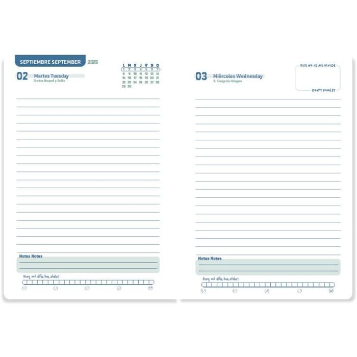 Agenda scolaire ANONYM Fleurs de Pissenlit 2025-2026 : Chez Agenda Jour Par Page 2024-2025 Format A5 Pour Enseignants Et Enseignants Agenda Scolaire Sections supplémentaires : comprend une feuille de temps, un planning hebdomadaire, un calendrier mensuel, un tableau des enseignants et une section pour les dates importantes. Préparez-vous pour la nouvelle année avec l'agenda scolaire Liderpapel 2025-2026., Conçu pour vous aider à garder le contrôle de toutes vos tâches et activités, cet agenda est le compagnon idéal pour les étudiants qui veulent s'organiser efficacement. Reliure à spirale : permet une manipulation facile et permet à l'agenda de rester ouvert à plat. Agenda scolaire 2025 / 2026 - A5 spirale - My 365 Bilingue : disponible en deux langues, idéal pour les étudiants des institutions bilingues. Optez pour un agenda scolaire A5, idéal pour les cartables et facile à transporter. Un agenda semainier à spirale offre une grande flexibilité, ou choisissez le planificateur scolaire 2025 pour une vue d'ensemble de vos tâches. La version économique est parfaite pour les budgets serrés, tout en restant pratique et élégant Papier de 70 g : grammage standard qui empêche le transfert d'encre, conforme à la certification FSC pour sa durabilité. Format A5 : compact et facile à transporter, parfait pour les sacs à dos et les sacs.