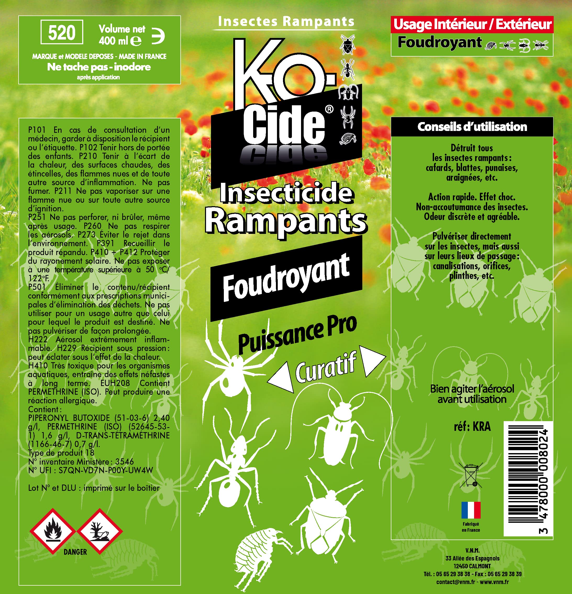 Produit destiné au grand public. La notoriété de K-ocide repose sur des valeurs essentielles : concevoir des produits à titre curatifs et préventifs, protéger l'habitat et respecter l'environnement. Propres et sans odeurs, toutes les laques résistent à l’eau et aux UV et présentent une action persistante dans le temps jusqu’à 8 mois en fonction des supports. La protection de l'habitat et de ses environs est leur rayon d'action. Ce fogger insecticide permet de traiter un volume équivalant à une pièce d’ environ 35m2., Attendre 12 h avant d'utiliser les matelas et aérer la pièce pendant 2 h Aérosol Anti Punaises 150ml Rouleau Visible Douzaines Laque Punaise De Lit Min Mexique Attribut Produit Longue Durée Punaises Lit Avant toute utilisation, lisez l’étiquette et les informations concernant le produit. VALEUR DE LA MARQUE : K-OCIDE s'engage depuis 30 ans auprès de ses consommateurs d'insecticides pour des formules efficaces et sans danger. Cet aérosol est équipé d’un diffuseur gros débit et longue portée. UTILISATION : K-OCIDE Laque anti-punaises et de lit s'utilise essentiellement dans un environnement intérieur contre les rampants. Aérosol volants rampants 500ml Effet foudroyant Description du produit Depuis plus de 30 ans, la marque K-OCIDE existe pour aider tous les particuliers et les professionnels à éliminer ces nuisibles qui arpentent nos maisons et nos jardins. L'opération est à renouveler seulement en cas de nécessité. PRODUIT LONGUE DUREE : Cette laque à rémanence permet un effet choc et d’abattage immédiat et est connu pour un traitment préventif et curatif des punaises de lit. C'est généralement le moment où les insectes sont présents. Laque anti-punaises et et punaises de lit Aérosol volants rampants 500ml Effet foudroyant Ingrédients Perméthrine 1,12 g/kg S-Méthoprene 0,33 g/kg Ether de (butoxy-2etoxy) 2 ehyle et propyle6piperonyle 26,03 g/kg Tétraméthrine 5,27 g/kg Mode d'emploi Aérosol extrêmement inflammable.