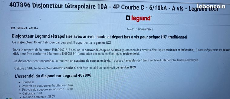 Disjoncteur Différentiel Legrand Dx3 10a Courbe C 30ma 2 Poles Type Hpi Auto Vis 82031385 Disjoncteur 10A 10kA courbe C tétrapolaire Legrand DX3 Auto Legrand Disjoncteur DX³6000 10kA arrivée haute et départ bas à vis, 4P, 400V~, 10A, courbe C, pour peigne HX³ traditionnel., Réf. Ce disjoncteur tétrapolaire est conforme à la courbe C (déclenchement magnétique 7 In ±20 %), occupant 4 modules. Il s'adapte aisément au peigne HX³ traditionnel tétrapolaire ou au câblage traditionnel, offrant ainsi une flexibilité d'installation appréciable Réf 407896 Disjoncteur Legrand Disjoncteur Différentiel Legrand DX3 10A Courbe C 10mA 2 Pol Disjoncteur Legrand 10a Nombre de pôle(s): 4 pôles , Connexion: Vis/vis , Peignes: HX³ tradi., ou câblage tradi.