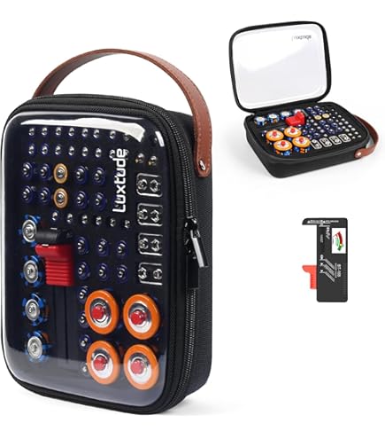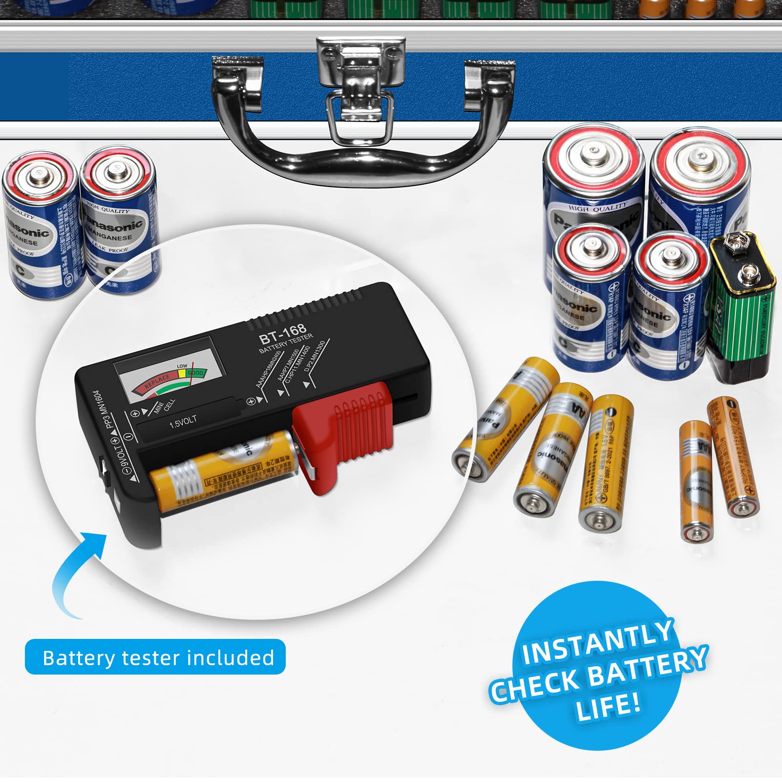 Organisateur de Batterie Boîte de Rangement avec testeur de Batterie (BT168), Sac de Transport Coffret Eva 120 Piles Avec Testeur Étui De Rangement Pour Piles Avec Testeur De Batterie AAA AA C D 9 V Et Rangement Pile √Assurance qualité - Par rapport aux produits sur le marché, notre valise est fabriquée à partir de matériaux respectueux de l'environnement. RLSOCO Sac de rangement de piles avec testeur de batterie - Boîte de rangement pour piles - Peut contenir 120 piles AA AAA C D 9 V BT-168 (Remarque : contient un testeur de batterie, pas de piles) √ Avec testeur de batterie - Notre boîte de rangement de piles est livrée avec un testeur de batterie qui peut mesurer rapidement la consommation de la batterie, de sorte que nous pouvons remplacer efficacement les piles en fonction de la consommation ! Étui de rangement de piles étendu]Peut contenir plus de 100 piles : 36,1 x 21,6 x 9,5 cm. Mais les piles ne sont pas incluses. Les matériaux ignifuges et anti-explosion garderont vos batteries 100 % en sécurité √ Matériau de haute qualité : la boîte de rangement de batterie est fabriquée en EVA haute densité et en fibre de polyester 1068D de haute qualité, qui peut résister efficacement aux chocs et à l'humidité. About this item √Large compatibilité-Ce support d'organisateur de batterie est largement compatible avec diverses batteries de différentes formes (Les piles et le testeur de piles ne sont pas inclus) √Haute Capacité-Il conserve en toute sécurité plus de 120 piles et le boîtier inférieur contient 42*AA, 49*AAA, 4*C, 4*D, 7*9V, 10*Piles de type bouton,1*Testeur de batterie et plus de... La mousse amovible est équipée de fentes découpées avec précision qui s'adaptent parfaitement aux piles de différentes tailles. √ Large compatibilité - Cette boîte de rangement de piles est compatible avec une variété de formes de batteries différentes et peut stocker plus de 120 piles en toute sécurité.