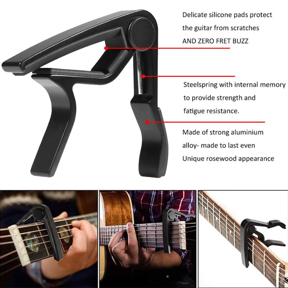 Instruments de musique - Découvrez notre offre Capodastre Guitare avec 5 Mediators Unique Utilisation à Une Main Changement Rapide en Alliage d'aluminium Noir Capos pour Ukul [127]. Livraison gratuite à partir de 25€* | Paiement sécurisé | 4x possible | Retour simple et rapide 🎵Caractéristiques: La corde est fermement pressée, la force est appliquée uniformément et le ton est clair. Capo Rapide Une Main Capodastre De Guitare électrique En Alliage à Dégagement Rapide Accessoire Guitare Acoustique électrique Ukulélé Caractéristiques: 1., Fabriqué en alliage, solide et durable., 2., Conception de forme élégante, concise et incurvée, s'adapte bien à la guitare et à d'autres instruments de musique, a une excellente sensation de main., 3., Ressort en acier de qualité avec mémoire interne qui résiste à l'usure., 4., Le tampon en silicone de qualité est conforme à la touche et les frettes peuvent assurer un bon son et éviter les rayures., 5., Excellente structure sur la base de la conception de la théorie de la mécanique, facile à ouvrir, mais peut serrer fermement et facile à rester à l'écoute. 🎵Facile à utiliser: tout en se déplaçant rapidement sur différents instruments,Convient parfaitement aux guitares électriques et acoustiques, au banjo ukulélé, aux guitares folk et à la mandoline, etc. Il sera bien clipsé sur les cordes et plus de bourdonnement de frette avec un capo haute performance. Capodastre en Forme de Requin - 5 Couleurs Fluo aléatoires Adagio - Capo Pro Deluxe Pour Guitares Acoustiques Et électriques Avec Libération Rapide Et Extracteur De Pince 🎵Matériau:Fabriqué en alliage de zinc de haute qualité, présente une résistance à l'oxydation et une dureté élevées, et atteint une résistance et une résistance à l'usure élevées. Après le changement de clé, la difficulté du morceau est réduite et la lecture est plus facile. Contenu du colis: 1x Capo à ressort 5x médiators
