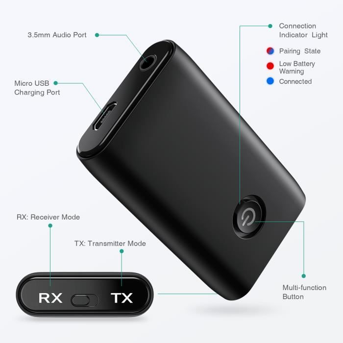 PLUG AND PLAY : Le récepteur émetteur Bluetooth 5., 1 prend en charge les connecteurs AUX et RCA de 3,5 mm et peut être inséré dans une petite carte mémoire, ce qui vous permet d'écouter de la musique n'importe où, n'importe quand. MODE RX : le récepteur-émetteur Bluetooth 2 en 1 en mode RX se connecte aux enceintes filaires, aux casques et reçoit le son des smartphones via Bluetooth et bénéficie d'une connectivité stable et d'un son stéréo., BLUETOOTH V5., 1 CHIP : Équipé de la dernière puce Bluetooth et d'un logiciel bien conçu, l'adaptateur Bluetooth permet non seulement de mettre à niveau les anciens appareils audio pour les rendre compatibles avec la technologie Bluetooth, mais il vous offre également un plaisir d'écoute comparable à celui d'un CD. MODE TX : le récepteur émetteur Bluetooth se connecte à des appareils non Bluetooth tels que TV, PC et lecteur MP3 via des prises AUX, en mode TX et diffuse le son vers des écouteurs, des haut-parleurs et des haut-parleurs de barre. Liste des colis : 1 x émetteur-récepteur Bluetooth ÉCRAN D'AFFICHAGE NUMÉRIQUE LED : L'adaptateur AUX Bluetooth est doté d'un écran d'affichage numérique LED qui vous permet de voir clairement l'état des différentes opérations. BLUETOOTH VERSION 5.1, HAUTES PERFORMANCES ET STABILITÉ] Rétrocompatible avec Bluetooth V5.0, V4.2, V4.1. Équipé d'une puissante puce Bluetooth 5.1, qui garantit que la transmission du signal Bluetooth est claire et stable, et que la connexion ne reste pas bloquée Akozon Émetteur Récepteur Bluetooth Bluetooth 5.0 émetteur récepteur 1 x câble AUX 3,5 mm , 1 x câble audio RCA Prise en de Bluetooth 5., 1, faible latence, réduction du bruit, vitesse et portée améliorées. Mode RX : le récepteur émetteur Bluetooth 2 en 1 en mode RX se connecte aux haut-parleurs filaires, aux écouteurs et reçoit le son des smartphones via Bluetooth et bénéficie d'une connectivité stable et d'un son stéréo., Puce Bluetooth V5., 1 : équipé de la dernière puce Bluetooth et d'un logiciel bien conçu, l'adaptateur Bluetooth aide non seulement à mettre à niveau les anciens appareils audio vers la capacité Bluetooth, mais vous donne également un CD comme un festin d'écoute. Signal fort Amplificateur de gain de signal intégré, connexion à la pièce sans angle mort, transmission à 10 mètres, qualité sonore sans retard, stabilité du signal sans décalage Transmetteur Audio Pour Voiture TV Goshyda Émetteur-récepteur Bluetooth, Adaptateur Bluetooth V5.0, Affichage Numérique LED Rechargeable, émetteur-récepteur De Musique Sans Fil Avec Micro HD, Modes Doubles RX TX, Prise Adaptateur Bluetooth émetteur Récepteur PLUG AND PLAY : Le récepteur émetteur Bluetooth 5.1 prend en charge les connecteurs AUX et RCA de 3,5 mm et peut être inséré dans une petite carte mémoire, ce qui vous permet d'écouter de la musique n'importe où, n'importe quand Prise en charge de Bluetooth 5., 1, faible latence, réduction du bruit, vitesse et portée améliorées. Commutation du mode réception/diffusion : appuyez sur la touche piste précédente/suivante et maintenez-la enfoncée. Sans conducteur Puce de décodage Bluetooth de haute qualité, transmission sans perte de niveau, son de théâtre en direct, meilleure qualité sonore, écoute des chansons sans délai. Sélection de la musique : appui court sur piste précédente ou piste suivante. Plug and play sans pilote. Plug and Play : le récepteur émetteur Bluetooth 5., 1 prend en 3,5 mm AUX et et peut être inséré dans une petite carte mémoire, vous permettant d'écouter de la musique n'importe où, n'importe quand.