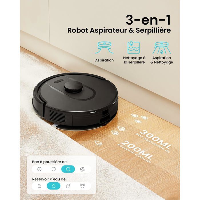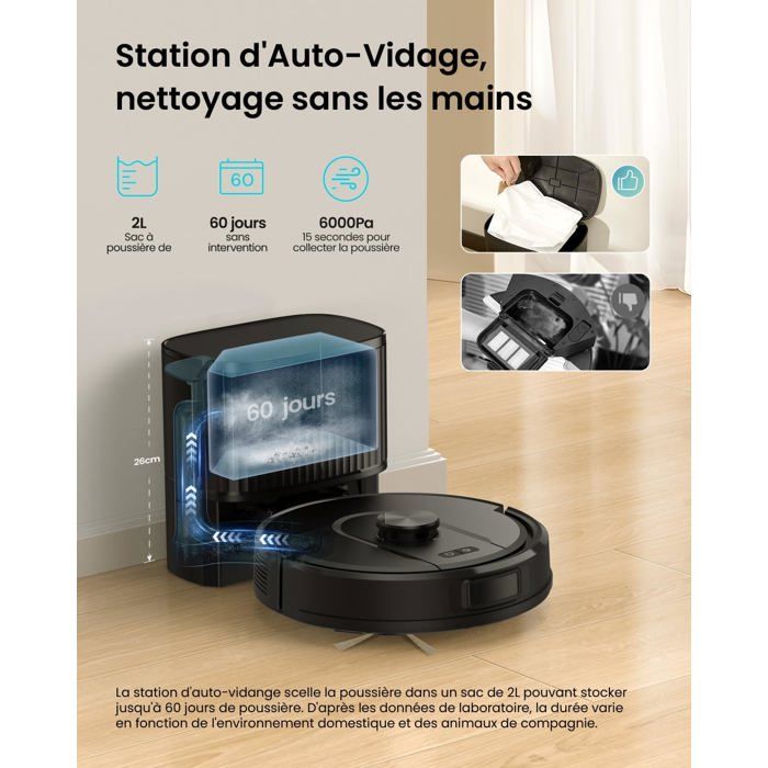 Robot Aspirateur Laveur Puissant Robot Aspirapolvere Lavapavimenti Con Mappatura Robot Aspirateur Laveur Cleanova W11 - Lidar 5000Pa - Vidange Auto - App/Alexa - 180min - Pour Tapis /animaux Robot Connecté Alexa Nettoyage Tapis Poils Animaux Il propose trois niveaux de puissance d'aspiration et trois niveaux de sortie d'eau, tous contrôlables via l'application pour s'adapter à différentes conditions. Robot Aspirateur Laveur avec Station,Aspiration 8000Pa,Vidange... Doté d’une puissance d’aspiration de 6000 Pa et d’une navigation LiDAR avancée, ce robot intelligent promet une maison impeccable sans effort de votre part. Grâce à sa fonction de vidange automatique de la poussière et sa compatibilité avec Alexa, il s’intègre parfaitement dans une maison moderne Pour les zones recouvertes de moquette dans votre salon, définissez une « zone interdite de serpillère » afin que l'robot aspirateur laveur puisse nettoyer sans passer la serpillère, gardant ainsi votre moquette sèche et impeccable. 【Autonomie de 180 Minutes & Auto-Recharge】L'aspirateur robot avec station Cleanova W11 est alimenté par quatre batteries lithium de 2600 mAh, offrant jusqu'à 180 minutes d'autonomie en mode silencieux—idéal pour les grandes maisons et les sessions de nettoyage prolongées. Test : vexilar Cleanova W11, robot aspirateur laveur 6000Pa 【Aspirant et Lavant 3 en 1】L'aspirateur robot laveur est équipé d'un réservoir d'eau de 300 ml et d'une cartouche à poussière deux-en-un de 200 ml, permettant l'aspiration, le balayage et le nettoyage simultanés du sol, ce qui facilite l'élimination de la saleté. W11 Robot Aspirateur Laveur avec Vidange Automatique Poussière, Navigation LiDAR,180min, Connecté par Alexa/APP Associé à une brosse rouleau en poils de caoutchouc, il capture efficacement la saleté sur tous les types de sols, des parquets aux moquettes à poils ras, garantissant que vos tapis restent impeccables. Pincez et zoomez simplement sur une case de la carte d'accueil pour définir des zones interdites pour les zones de jouets, les salles de bains et les zones où il est facile de se coincer, en veillant à ce que l'aspirateur robot les évite complètement. 【Zones interdites et murs virtuels】L'aspirateur robot peut être configuré avec jusqu'à 15 zones interdites, zones interdites et murs virtuels. La station de base à auto-vidage de l’robot aspirateur Cleanova W11 est équipée d’un grand sac à poussière de 2 L, qui transfère efficacement la poussière et les débris du bac du robot au sac. 【Collecte automatique de la poussière】Profitez de 60 jours de nettoyage mains libres ! 【Aspiration Puissante de 6000Pa avec Moteur Sans Brosse】L'aspirateur robot laveur Cleanova W11 est équipé d'un moteur sans brosse haute performance qui offre jusqu'à 6000Pa d'aspiration puissante, éliminant efficacement la poussière, les débris et les poils d'animaux sur une variété de surfaces.