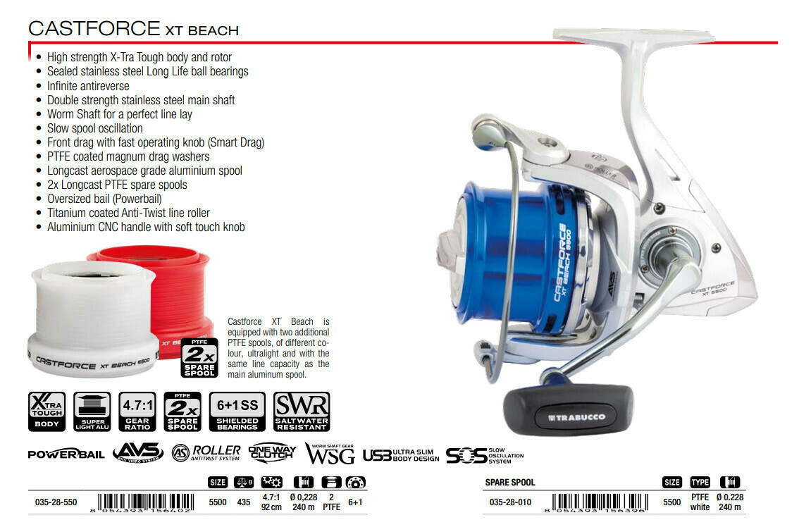 Moulinet 5500 Rapport 4.7:1 Trabucco Castforce XT Beach 5500 Light Surfcasting Reel Wt 435g Plus 2 Extra Ptfe Spools New 2021 P310190886 Pêche Plage Bobine De Rechange <br>Capacité : 0,228 mm - 240 m <br>Bobine de rechange : 2., <br>Roulements : 6 + 1., </p> Peche Carpe Moulinet De Surfcasting Trabucco Castforce XT5500 - 2 Bobines De Réserve - Ratio 4,7:1 - Manuel Tactile Turn