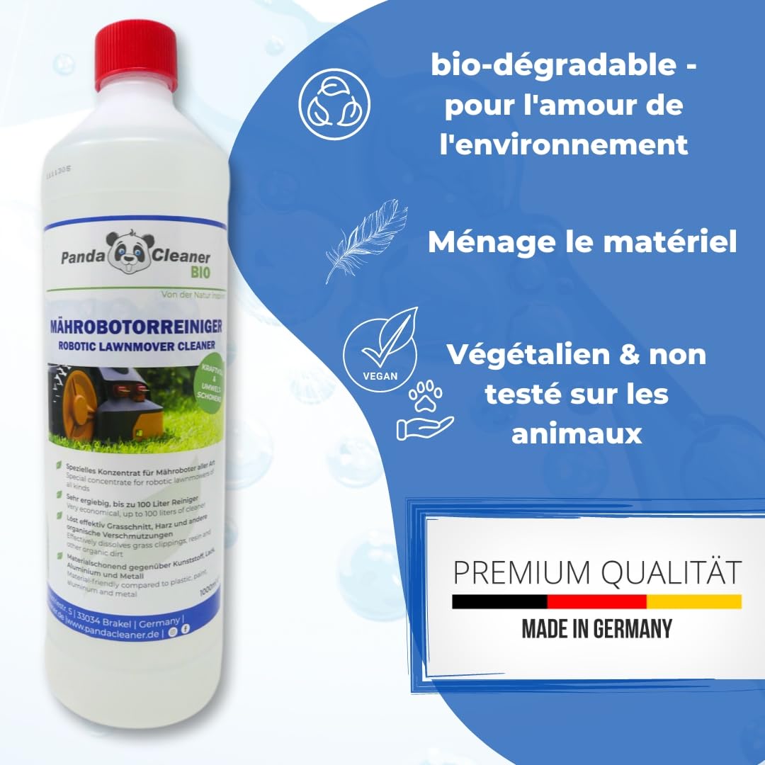 Doux pour le plastique et le métal : conçu pour les surfaces délicates, nettoie en profondeur sans produits chimiques agressifs, sans odeur et sans attaquer les matériaux. Un nettoyage régulier facilite l'entretien et réduit la consommation de détergent. Nettoyant spécial de qualité supérieure pour robots tondeuses et outils de jardin – Élimine de manière fiable les résidus d'herbe, les jus de plantes et la saleté, idéal pour les robots tondeuses à gazon, les débroussailleuses et les taille-haies sans fil Engrais gazon robot tondeuse et mulch enrichie en bactérie Ingrédients biodégradables : sans étiquetage CLP, développés de manière durable et conditionnés dans une bouteille réutilisable de qualité supérieure. Nettoyant Spécial Façade 5L | Leroy Merlin Facile à utiliser - Déjà prêt à l'emploi : vaporiser, laisser agir, essuyer ou rincer ; nettoyage régulier hebdomadaire recommandé pour un entretien optimal. Qualité supérieure - Développé et fabriqué en Allemagne selon les normes de qualité les plus élevées. Nettoyant Pour Robot Tondeuse Dreame A1 Robot Tondeuse Intelligente, Tondeuse à Gazon Robotisée Sans Fil Périmétrique Produit Entretien Jardin Allemand Nettoyant spécial de qualité supérieure pour robots tondeuses et outils de jardin – Élimine de manière fiable les résidus d'herbe, les jus de plantes et la saleté, idéal pour les robots tondeuses à gazon, les débroussailleuses et les taille-haies sans fil. La formule haut de gamme élimine de manière fiable les jus de plantes, les résidus d'herbe, la terre et autres dépôts – sans produits chimiques agressifs. Pour les appareils sensibles à l'humidité, vaporisez le nettoyant sur un chiffon et nettoyez uniquement avec un chiffon humide.