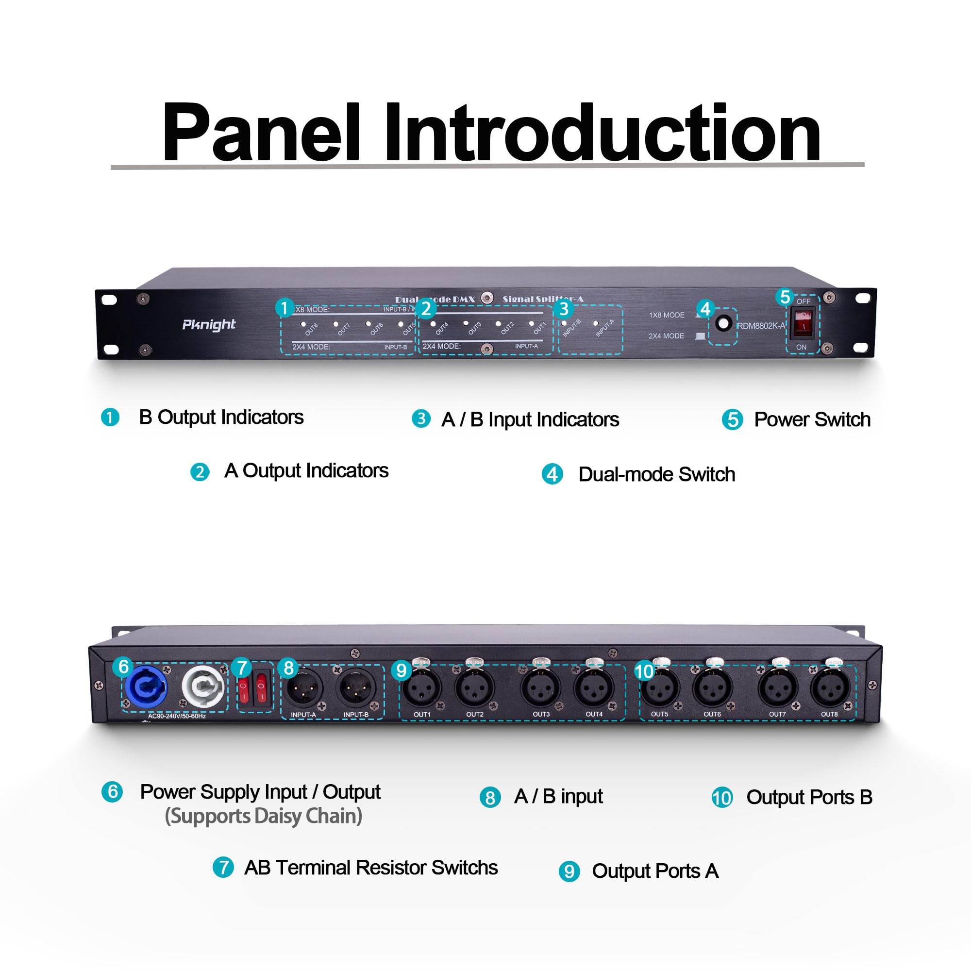 Q4 : Quel est l’avantage de la prise en charge du sACN Multicast et de la gestion des priorités ? A4 : Le sACN Multicast transmet le DMX à plusieurs récepteurs de manière efficace. Remarque : si ACTION est allumé mais pas le DMX, le signal reçu n’est pas de l’ArtNet et ne peut pas être traité., Choisissez entre 2., x., x., x, 10., x., x., x, 192., 168., 1., x (auto) ou DHCP. DC 5V via Type-C pour les usages portables ou tests ; Compra online Pknight Convertidor Bidireccional de 4 Puertos Art-Net/sACN a DMX512, un nodo compacto con PowerCON, PoE y USB-C para iluminación escénica – CR041R MK II Conversion de protocole bidirectionnelle : chaque port prend en charge à la fois l’entrée et la sortie DMX. Permet la multidiffusion sACN et le contrôle des priorités pour une intégration fluide dans les systèmes d’éclairage multi-sources. Q1 : Chaque port DMX peut-il être configuré en entrée ou en sortie ? A1 : Oui, les quatre ports DMX du CR041R MK II sont configurables individuellement en Entrée ou Sortie. AC via PowerCON (90–240V, 50/60Hz) pour une alimentation stable et durable. Réglez l’IP statique ou changez-la via le menu intégré, sans PC. Boîtier compact avec RJ45 verrouillable : l’enceinte métallique robuste au format compact garantit une grande durabilité. Vous pouvez changer facilement la direction via le menu intégré pour s’adapter à divers systèmes d’éclairage. 4 Universes Art-Net / sACN Node Sélectionnez Factory Set YES, puis maintenez Entrer pendant 2–3 secondes jusqu’à ce que Setting clignote réinitialisation terminée. équipement éclairage Scénique Pknight Convertidor Bidireccional De 4 Puertos Art-Net/sACN A Convertisseur SACN PoE Description du produit Aperçu Lorsque le titre du menu commence à clignoter, le paramètre a été enregistré avec succès. Indicateur STA : lumière bleue clignotante lorsque la réinitialisation d’usine est effectuée et que les paramètres sont sauvegardés. Il est équipé d’un écran couleur de 1,8” et d’un menu à boutons, offrant une configuration autonome sans PC. Son boîtier métallique robuste et sa compatibilité avec le montage sur structure (truss) en font un choix idéal pour la scène, les tournées et les installations fixes. Le RJ45 verrouillable (etherCON) assure une connexion de données sécurisée pour les spectacles en direct et les installations. Q2 : Quels protocoles sont pris en charge ? A2 : L’appareil prend en charge Art-Net et sACN. Quatre indicateurs d’état Indicateur POWER : lumière blanche allumée lorsque l’appareil est sous tension. Options de montage multiples Enables sACN multicast and priority control for seamless integration into multi-source lighting systems. Triple power options - AC, USB-C, PoE Triple options d’alimentation PoE via RJ45 pour une installation simplifiée avec un seul câble ; Indicateur ACTION : lumière orange allumée lorsque l’appareil reçoit des données réseau. Trous M10 pour montage horizontal/vertical sur structures, compatible rail DIN, mais non adapté aux installations en rack. Il offre également la prise en charge du sACN Multicast et la gestion des priorités, garantissant une intégration fluide avec les réseaux d’éclairage professionnels.