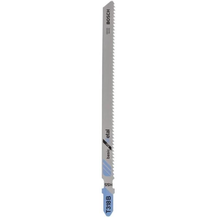 Achetez votre Lame de scie sauteuse pour tôles en acier T 118 AHM au meilleur prix. Livraison 24/48h Lame de scie sauteuse T 118 AF Flexible for Metal résistante à la rupture lors des découpes rectilignes dans le métal Lames Scie Sauteuse Bosch Accessories Professional 5x Lames De Scie Sauteuse T 118 EFS Basic For Inox (pour Tôles En Acier Inoxydable, Accessoire Scie Sauteuse), Multicolor, 1.5 - 4 Mm Lame Scie Sauteuse Bosch Sa denture ondulée et fraisée est conçue pour la découpe de la tôle. Combinaison bimétal d’une denture progressive HSS et d’un corps HCS extrêmement flexible réduisant le risque de cassure Dimensions : 17,4 x 0,2 x 13,9 cm Lame de scie sauteuse T 118 A Basic for Metal pour des découpes rectilignes dans le métal Denture ondulée et fraisée idéale pour les découpes sans exigence particulière Lame en acier trempé à coupe rapide de haute qualité pour la découpe de tôles standards non perforées Denture à pas progressif très fin (1,1 à 1,5 mm) pour la découpe de tôles pleines très fines d’une... Bosch Professonal Stchsägeblatt Bosch T 118 AF Stchsägeblätter Pour scies sauteuses avec systèmes de fixation en T. Denture ondulée et fraisée conçue pour la découpe de la tôle Elle présente une denture à pas progressif très fin (1., 1 à 1., 5 mm) et permet la découpe d’une ga mme de tôles fines (1 à 3 mm) en métal plein.