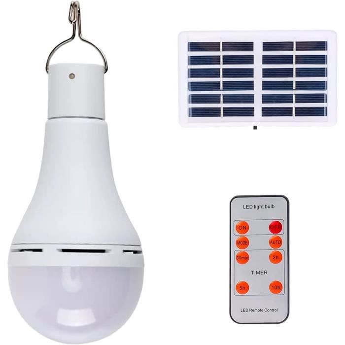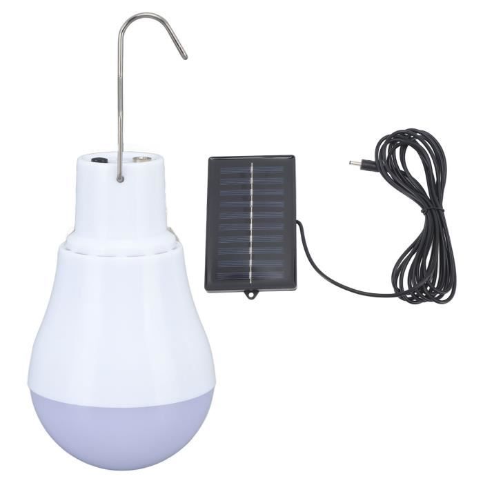 Ampoule LED solaire rechargeable par USB et étanche pour extérieur Télécommande incluse Luminosité réglable pour chaque instant : cette ampoule solaire extérieure dispose de trois niveaux de luminosité (faible, moyen, élevé), idéal pour répondre à vos besoins - de la lecture en magasin à l'éclairage de votre camping sous les étoiles. Ampoule Solaire Extérieure Camping Lampe Solaire Rechargeable à Crochet Pour Tente De Maison, 3 Modes D'éclairage, Ampoule Rechargeable Pour Tente, Convient Pour Le Camping, La Randonnée, Les Voyages, Les Urgences, Le Camping (1 Ampoule LED Solaire 3 Modes Idéal pour le camping, la randonnée et les urgences, se recharge par USB ou énergie solaire et fonctionne comme lampe de poche ou lampe suspendue. Utilisation polyvalente et multifonctionnelle : parfaite pour le camping, la randonnée, la pêche ou les coupures de courant. Cette ampoule solaire rechargeable est une solution d'éclairage polyvalente pour l'intérieur et l'extérieur, indispensable pour votre équipement. VGEBY ampoule extérieure portable Ampoule LED de camping ampoule USB à économie d'énergie avec... Charge USB 100W--Ampoule LED Solaire-DC Rechargeable avec Télécommande Durée de fonctionnement : 6 à 12 heures., Puissance : 5 W., Caractéristiques : 1., Luminosité réglable : cette ampoule solaire extérieure offre trois niveaux d'intensité pour s'adapter à différentes activités de plein air., 2., Design suspendu : équipé d'un crochet, l'ampoule solaire extérieure peut être utilisée comme lampe de poche ou lampe suspendue dans les magasins ou les branches., 3., Double charge efficace : l'ampoule solaire extérieure se recharge facilement par énergie solaire ou USB, idéale pour les urgences., 4., Robuste et portable : fabriquée en ABS durable, cette ampoule solaire extérieure est légère, compacte et parfaite pour les conditions extrêmes., Remarque : 1., Les mesures étant prises à la main, les tailles indiquées peuvent varier légèrement., 2., La couleur de l'article peut varier de celle de la photo, en fonction des paramètres d'affichage et de luminosité de votre ordinateur., 3., Bon achat en ligne ! Légère et compacte, facile à transporter : avec un design ultra léger et des dimensions réduites, cette lampe tient dans n'importe quel sac à dos sans prendre de place. Temps de charge : 4 à 6 heures.