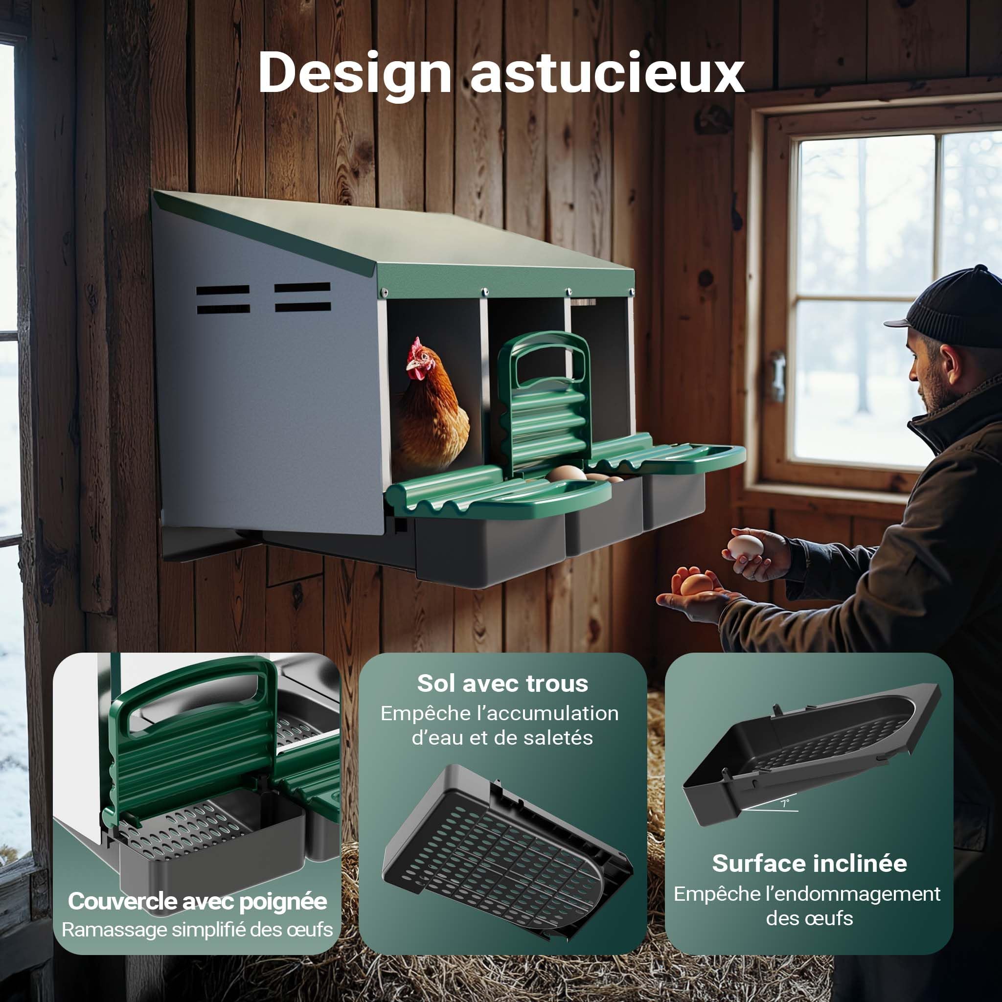 Taille réglable : le nid pour poules est équipé de 1, 2, 3, 4 ou 5 compartiments et est idéal pour les poules normales à grandes, par exemple les bramas, les cochins et les orpingtons. VEVOR Pondoir à Poules, 8 Compartiments, Nichoirs Inclinés en Métal Nid Pondoir 1 compartiment GAUN avec cuvette pour Poule Avec bac de récupération des œufs : les œufs roulent doucement dans le bac de récupération des œufs intégré avec couvercle, de sorte qu'ils peuvent être facilement retirés de l'extérieur sans déranger la poule pondeuse. Comprend un bac de récupération avec couvercle inaccessible aux volailles pour protéger les œufs. Ce nid de déroulement robuste en métal avec une base en plastique garantit que les poules se sentent à l'aise et aiment revenir. L'escabeau en plastique à l'entrée facilite l'accès, tandis que le bac récupérateur vous permet de retirer les œufs rapidement et facilement, sans saleté ni effort Montage mural : le pondoir pour poules peut être fixé au mur de manière stable à la hauteur souhaitée, ce qui permet aux poules de pondre dans une position naturelle. Double pondoir stable en métal galvanisé avec base en plastique confortable. Cage A Poule S Pondeuses COPELE Nid Pour Poules, Fabriqué En Plastique Et Avec Tiroir, Avec Plateau Récupérateur D'u0153ufs, Idéal Pour Extérieur Cage Ou Poulailler Pondoir Poule Cage A Poules Extérieur
