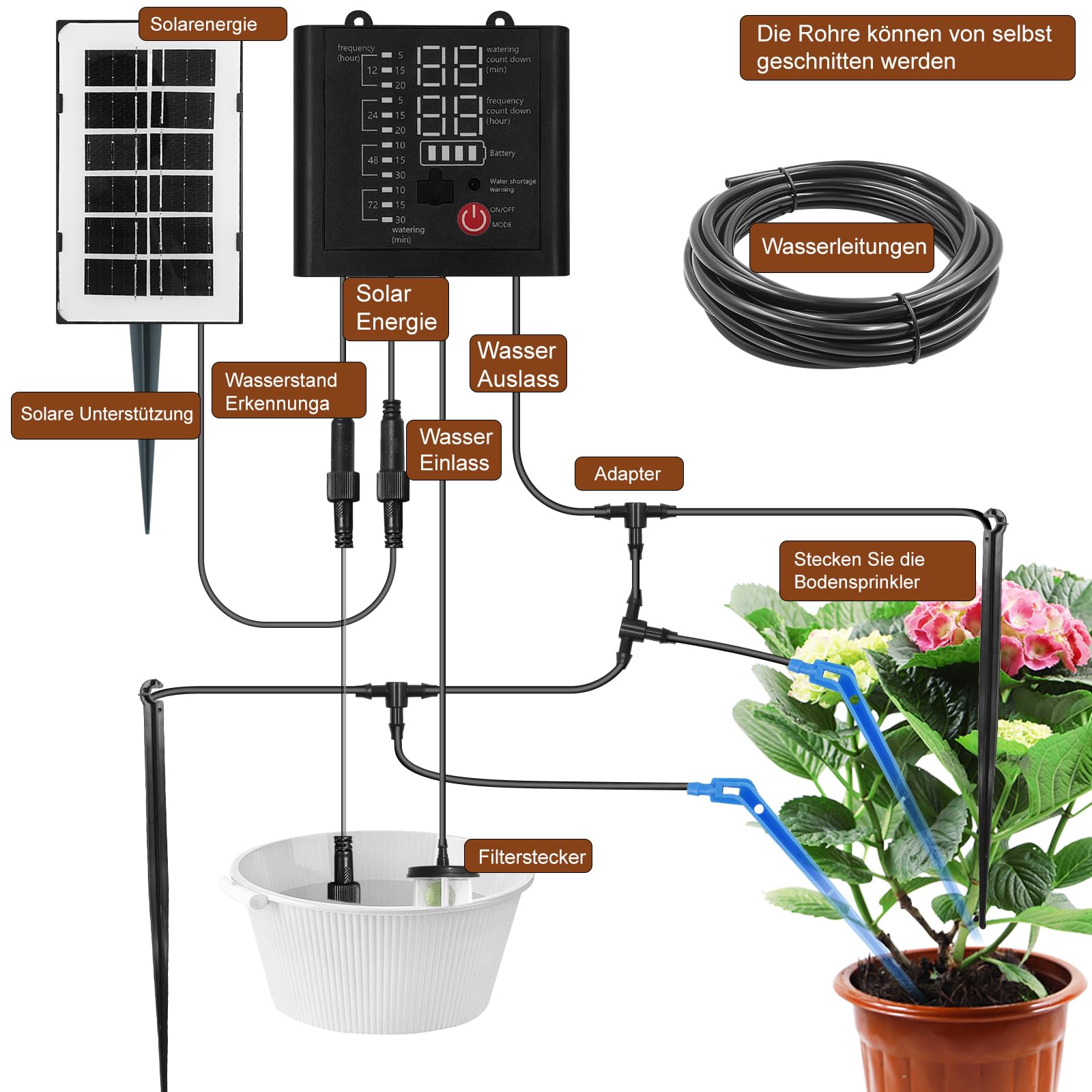 Ainsi, l'eau est absorbée de manière optimale et le gaspillage d'eau minimisé. Plan d'arrosage flexible et réglable : avec le système d'irrigation automatique pour l'intérieur, vous pouvez régler de manière flexible le temps d'arrosage (1 à 600 s), la fréquence d'arrosage (1H/12H/1-9 jours) et le débit maximum de 1,2 l par minute. Système d'arrosage automatique goutte-à-goutte pou... – Grandado Kit d'arrosage goutte-à-goutte 10 à 30 m • Mister Arrosage Le plastique ABS de qualité supérieure assure une longue durée de vie et une résistance aux différentes conditions météorologiques. Kit D'irrigation Goutte à Goutte Automatique énergie Solaire, Irrigation Solaire Système d Système d'irrigation complet : le kit d'irrigation goutte à goutte comprend : 1 appareil, 1 tuyau en caoutchouc de 3 m, tuyau en PVC de 15 m, 1 filtre, 1 joint à trois voies, 15 adaptateurs gouttes, 15 câbles de charge. La quantité est complète pour répondre à vos besoins dans différents scénarios. Arrosage Programmable USB Kit Arrosage Automatique Goutte À Goutte Énergie Solaire Pour Jardin, Système D'Irrigation Système Arrosage Plantes Pot Vous pouvez régler le mode d'arrosage en fonction des besoins de vos plantes. Arrosage automatique et sans stress : dites adieu au travail d'arrosage quotidien et profitez des avantages d'un arrosage intelligent Notre système d'irrigation automatique garantit que vos plantes reçoivent toujours la bonne quantité d'eau, sans votre intervention. Grâce aux temps d'arrosage et à la fréquence réglables individuellement, vous pouvez programmer le système selon les besoins spécifiques de vos plantes afin qu'elles soient alimentées de manière optimale, que vous soyez à la maison ou en déplacement.