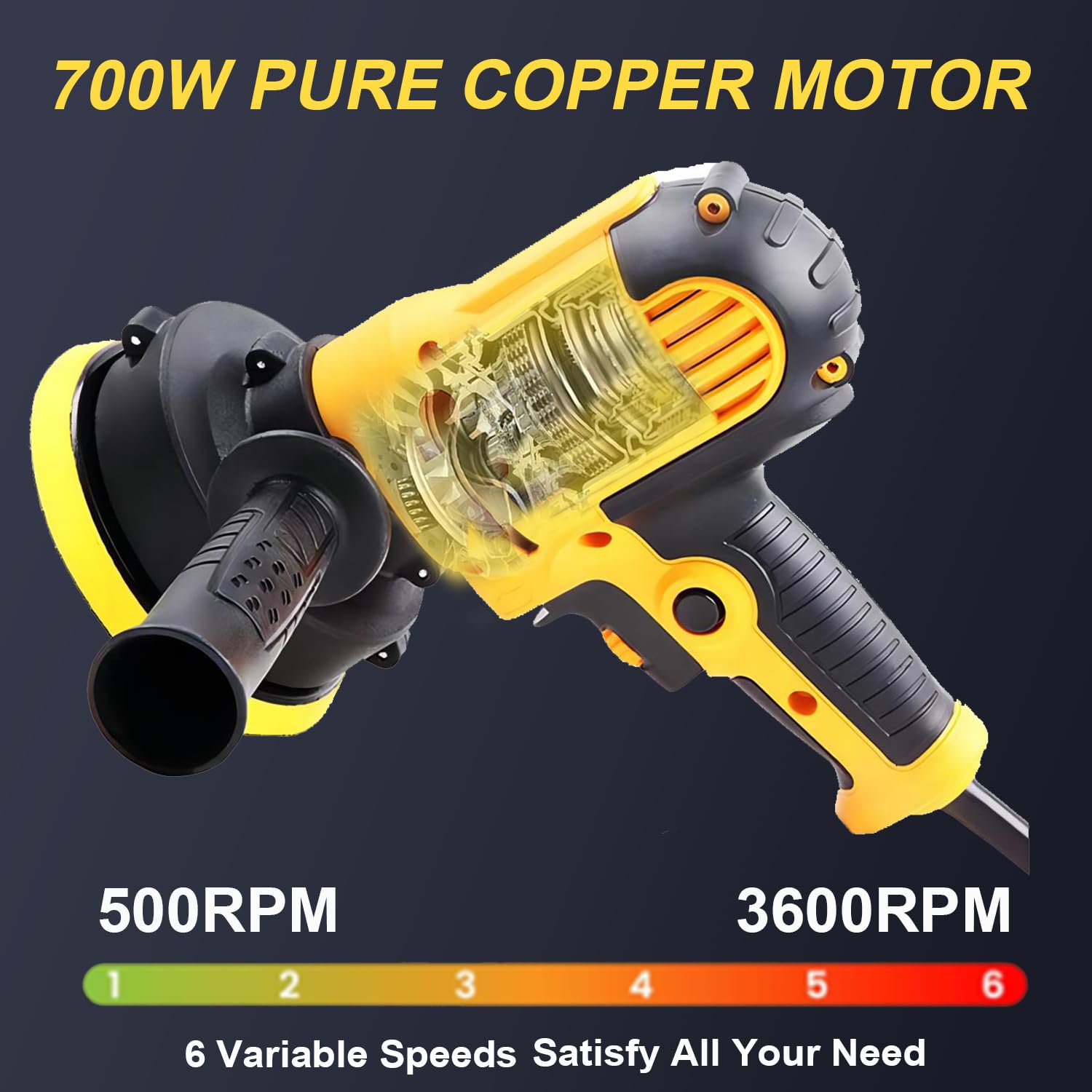 Poignée Amovible Peut être installée selon les habitudes d’utilisation pour un meilleur levier et une manipulation plus facile. Vitesse réglable : vitesse variable réglable de 600 à 3700 tr/min, faible vitesse pour cirer et polir, vitesse moyenne pour le polissage et le nettoyage, haute vitesse pour enlever la peinture et l'oxydation Verrouillage de Vitesse Appuyez sur le bouton pour bloquer la vitesse. Le cadran à 6 vitesses permet d'ajuster la rotation de 600 à 3700 tr/min, s'adaptant à divers scénarios de polissage. Contenu Complet du Kit : Inclut 1 polisseuse, 1 plateau auto-adhésif, 3 plateaux de polissage plats, 3 plateaux de polissage ondulés, 2 bonnets en laine, 2 bonnets en microfibre bleue, 5 abrasifs, 1 clé, 1 poignée amovible et 1 chiffon de nettoyage. Machine Lustrage Cirage Voiture Polisseuse Voiture 980W Polissage 6 Vitesse Variable Machine à Polir Polisseuse Avec Plateau Auto-adhésif Après déverrouillage, vous pouvez toujours la modifier à volonté. Design Ergonomique : Ce kit de polisseuse inclut une poignée ergonomique amovible, permettant aux utilisateurs de choisir une prise confortable selon leurs habitudes. Le bouton de verrouillage de vitesse maintient une vitesse constante, minimisant la fatigue pendant l'utilisation. Vents de Refroidissement Assurent un échange continu d’air entre l’intérieur et l’extérieur pour éviter la surchauffe du moteur. Polisseuse de voiture : 10 conseils pour acheter - Polisseuse Lustreuse Réglage Multi-Vitesses : La polisseuse prend en charge un contrôle de vitesse variable. Meilleure polisseuse voiture : avis & guide achat complet
