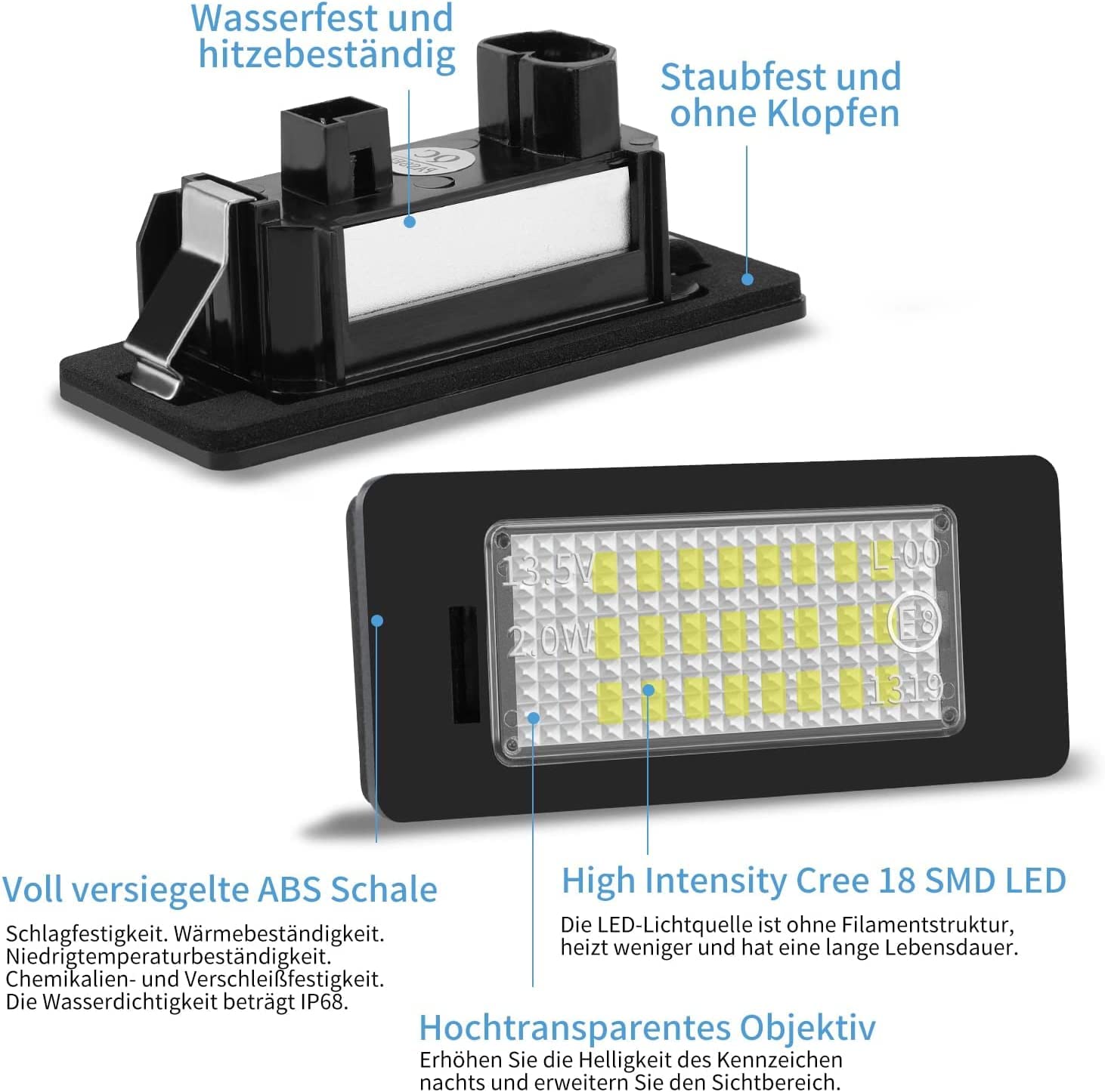 E - Des marques de contrôle sont disponibles et l'éclairage de plaque d'immatriculation LED est donc exempté d'enregistrement NUROTA Kennzeichenbeleuchtung LED für Astra G H J K, Corsa A B C D E Lot de 2 lampes de plaque d'immatriculation sans erreur Utilisation adaptée pour BMW Série 1 3 5 E39 E60 E61 F10 F30 E82 E88 E90 E91 E92 E93 X5 E70 X6 E71 12 V Compatible avec BMW X6 E71, E72 ; X5 E70, F15, F85 ; X3 F25, X1 E84, F48 Compatible avec BMW Série 3 E90, E91, E92, E93, E46, F30, F31, F34, F80 ; Série 2 F22, F23, F45, F87 ; Série 1 E82, E88 Rockeybright H7 LED scheinwerfer Clip für BMW 5 Se... – Grandado Le montage est simple, retirez l'ancien éclairage, insérez le nouveau., Ne pas visser. Remplacement pour BMW 5er E39 E60 E61 F10, X5 E70, X6 E71, 3er E90 E91 E92 E46., ., Numéro(s) de référence OE : Éclairage de plaque d'immatriculation LED, feux de plaque d'immatriculation, éclairage de plaque d'immatriculation, éclairage de plaque d'immatriculation, 63267165646, 63268360591, 63268372001, 7165646, 8360591, 8372001 Compatible avec les types de véhicules suivants : BMW Série 5 Berline (E39) 11., 1995 - 06., 2003 BMW Série 5 Berline (E60) 12., 2001 - 03., 2010 BMW Série 5 Berline (F10) 01., 2009 - 10., 2016 BMW Série 5 Touring (E61) 03., 2004 - 12., 2010 BMW Série 5 Touring (E39) 09., 1996 - 05., 2004 BMW Série 5 Touring (F11) 11., 2009 - 02., 2017 BMW Série 5 GT (F07) 01., 2009 - 02., 2017 BMW Série 4 Coupé (F32, F82) 07., 2013 - ., ., ., BMW Série 4 Cabriolet (F33, F83) 10., 2013 - ., ., ., BMW Série 4 Gran Coupé (F36) 03., 2014 - ., ., ., BMW Série 3 Berline (E90) 06., 2004 - 12., 2011 BMW Série 3 Berline (F30, F80) 03., 2011 - 10., 2018 BMW Série 3 Touring (E91) 12., 2004 - 06., 2012 BMW Série 3 Touring (F31) 07., 2011 - 06., 2019 BMW Série 3 Coupé (E92) 11., 2005 - 12., 2013 BMW Série 3 Coupé (E46) 06., 2003 - 07., 2006 BMW Série 3 Cabriolet (E93) 05., 2006 - 12., 2013 BMW Série 3 GT (F34) 07., 2012 - ., ., ., BMW X6 (E71, E72) 06., 2007 - 06., 2014 BMW X5 (F15, F85) 07., 2013 - 07., 2018 BMW X5 (E70) 02., 2006 - 07., 2013 BMW X3 (F25) 09., 2010 - 08., 2017 BMW X1 (E84) 03., 2009 - 06., 2015 BMW X1 (F48) 11., 2014 - ., ., ., BMW Série 2 Coupé (F22, F87) 10., 2012 - ., ., ., BMW Série 2 Active Tourer (F45) 11., 2013 - ., ., ., / BMW Série 2 Cabriolet (F23) 03., 2014 - ., ., ., BMW Série 1 Coupé (E82) 10., 2006 - 10., 2013 / BMW Série 1 Cabriolet (E88) 03., 2008 - 12., 2013 Feux Plaque LED BMW Série 3 5 X5 KASturrboo Éclairage Lumière Plaque D'immatriculation éclairage Plaque Immatriculation