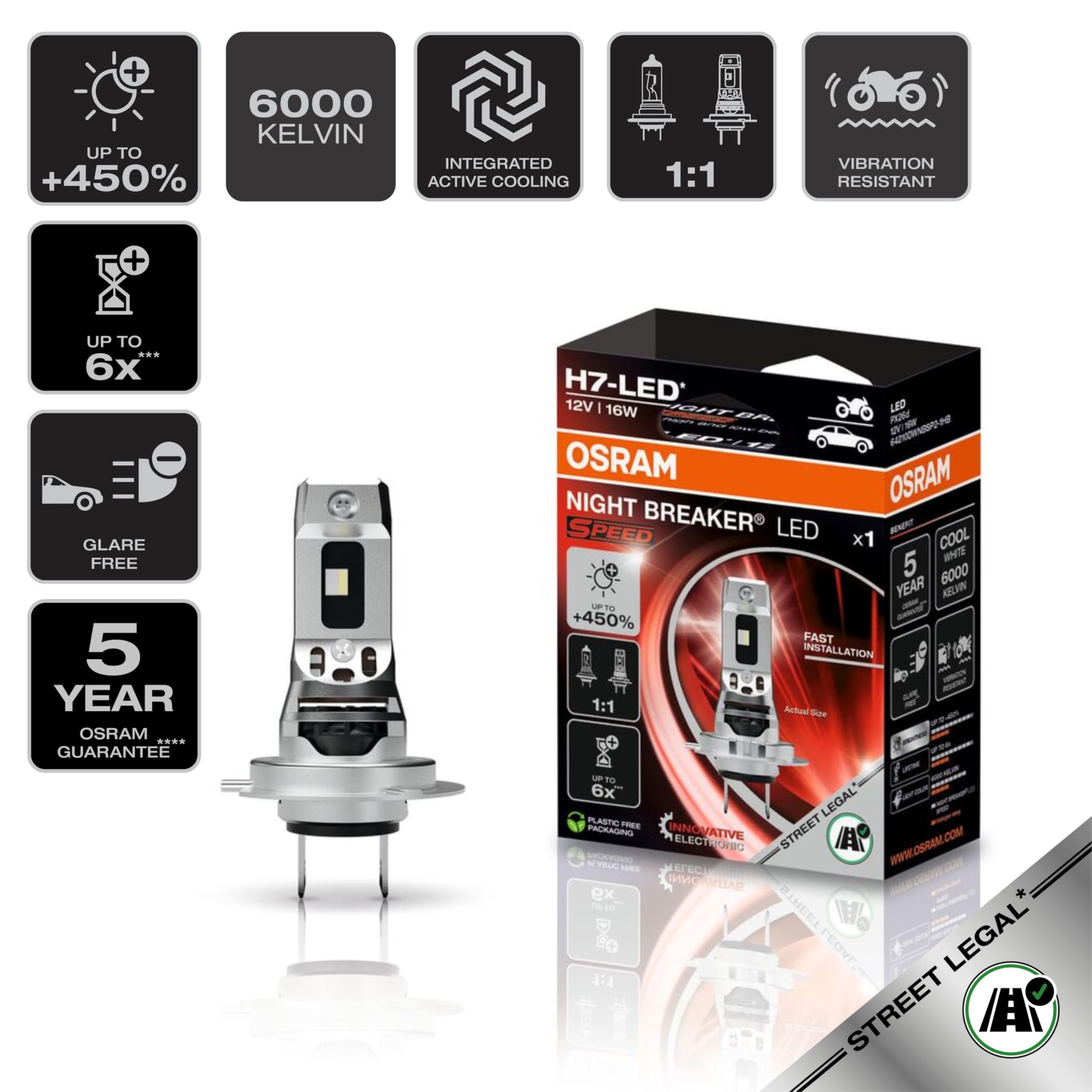 La nouvelle version du NIGHT BREAKER LED SPEED H7 homologué pour la voie publique(1) a été revue, améliorée techniquement et perfectionnée, ainsi que le NIGHT BREAKER LED SPEED H4 homologué pour la voie publique(1), le tout nouveau venu dans la gamme NIGHT BREAKER LED. Durée de vie jusqu'à 6 fois supérieure à celle des lampes halogènes traditionnelles. Installation simple et rapide : compatibilité mécanique 100% avec les lampes H7 normalisées Remplacez dès maintenant vos ampoules de voiture classiques par les ampoules LED de remplacement révolutionnaires NIGHT BREAKER d'OSRAM et profitez d'une luminosité exceptionnelle, homologuées pour la route(1). OSRAM NIGHT BREAKER H7 LED 230% Set für Hyundai i20 12-15 64210DWNBG2 Zulassung selon les modèles de véhicules et les fonctions d'éclairage actuellement répertoriés dans la liste de compatibilité. Aucun culot ni adaptateur supplémentaire n'est requis pour l'installation de l'ampoule. Comparées aux ampoules standard, telles que les ampoules halogènes, ces ampoules LED de remplacement consomment jusqu'à 60 % d'énergie en moins et, grâce à la technologie LED et à leur conception spécialement conçue pour résister aux vibrations, leur durée de vie est jusqu'à six fois supérieure(3). Veuillez suivre la procédure qui y est décrite avant et après l'installation. Ces ampoules LED de remplacement conviennent parfaitement aux ampoules et douilles classiques. Avec les ampoules LED NIGHT BREAKER H7 450 et NIGHT BREAKER H4 450 homologuées pour la route(1), vous pouvez désormais convertir les feux de route et de croisement de votre véhicule à la technologie LED de pointe. Plus d'informations sont disponibles sur osram., com/nb-led. Aucun scintillement ni message d'échec lors du test de la lampe froide. Night Breaker LED Rapide et facile. Ampoules Led OSRAM NIGHT BREAKER LED SPEED H7 450 Pour Motos, Lampe LED Retrofit Pour Motos Avec Homologation Routière, Jusqu'à 450% De Luminosité En Plus, 6000 K, Installation Rapide, LEDEC02 Intégré, 1 Jusqu'à 50 % d'éblouissement en moins (par rapport aux exigences minimales de la norme ECE R112, avec un éblouissement jusqu'à 50 % inférieur aux valeurs maximales autorisées). Pour une installation rapide et un remplacement facile de vos ampoules halogènes, et une amélioration de qualité pour voir et être vu avec les ampoules LED OSRAM homologuées pour la route(1). Efficacité accrue, notamment grâce à une électronique innovante et optimisée. Aucun adaptateur ni culot requis. (2) Comparé aux exigences minimales de la norme ECE R112, l'éblouissement est jusqu'à 50 % inférieur aux valeurs maximales autorisées. Contrôle technique individuel et officiellement agréé (TÜV & KBA). Conception 1:1 : dimensions et compatibilité mécanique inspirées des lampes traditionnelles. Elles offrent une lumière blanche moderne et éclatante avec une température de couleur allant jusqu'à 6 000 K, un flux lumineux stable même avec une batterie faible et impressionnent par leur luminosité exceptionnelle(2), tandis que l'éblouissement des autres usagers de la route est jusqu'à 50 % inférieur aux valeurs maximales autorisées(2). présente une innovation révolutionnaire de lampe LED retrofit qui combine homologation route 1), installation rapide et facile, vision et visibilité exceptionnelles, une mise à niveau moderne du véhicule, sécurité et fiabilité, et bien plus encore dans une seule lampe De plus, OSRAM offre une garantie dédiée sur toutes les ampoules LED de remplacement NIGHT BREAKER(2). H7 LED-lampa Osram Night Breaker SPEED godkänd för motorcykel