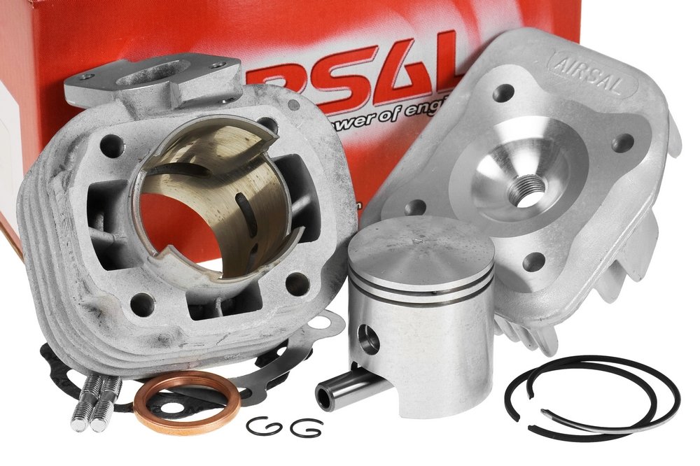 Kit cylindre 65 ccm AIRSAL T6 Racing pour Peugeot 103 T3, 104 T. Main d'œuvre Peugeot 103 - 65cc Airsal T6 | OLV Motors Piston Airsal T6 pour 103 Le T6,contrairement au cylindre sport, dispose d’une sortie en 3 parties et de temps de commande modifiés, qui font que ce cylindre aime la vitesse et est sensible, libère plus de performance que la série 50 Sport. Livré avec tous les composants nécessaires pour le montage tels que piston, etc. Kit cylindre Racing 65 ccm de la marque Airsal. Livré avec tous les composants nécessaires pour le montage tels que piston, etc. (le kit piston et la culasse ne sont pas inclus dans la livraison Les cylindres sont ainsi moins sujets à l’usure et les pistons ne se coincent pas à cause de problèmes de température. Kit cylindre Racing 65 ccm de la marque Airsal. Kit Montage Moteur Scooter Performance Kit Cylindre Airsal T6 49,4cc 40mm Peugeot 103/104 Chrome Dur
