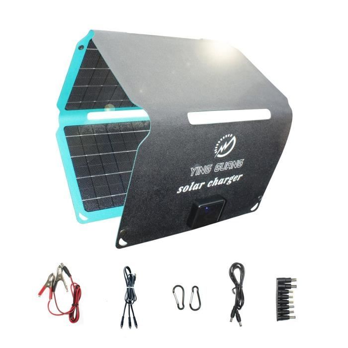 RealPower Chargeur solaire 22 W - Panneau solaire monocristallin pliable avec port USB QC 3.0, ETFE étanche, léger pour tablette, smartphone, batterie externe et voyage en camping Finition ETFE : les quatre panneaux solaires pliables sont étanches et anti-poussière grâce au revêtement ETFE et au polyester 600D, IPX5, ce qui le rend idéal pour vos activités de plein air. Solar 28W Chargeur Solaire Pliable 60W, BigBlue Panneau Solaire Portable ETFE QC3.0 PD45W CC Sortie 22,2V[IP68 étanche Et Support D'angle]pour Camping, Compatible Avec Smartphone Tablette Station D'alimentation Big Blue RealPower Chargeur solaire 22 W - Panneau solaire monocristallin pliable avec port USB QC 3., 0, ETFE étanche, léger pour tablette, smartphone, batterie externe et voyage en camping Taille dépliée : 28 x 81 cm. Il est donc idéal pour le camping, les camping-cars, les randonnées dans la nature, les pique-niques et les festivals. Grâce à sa conception pliable, le panneau solaire mobile est facile à transporter et à ranger. De cette façon, vous pouvez facilement le mettre dans votre sac ou votre sac à dos, de sorte que vous l'ayez toujours à portée de main lors d'une randonnée, d'un voyage de camping ou d'une journée chargeur solaire pour tablette Chargez tous les appareils USB : équipé de 1 interface USB-A, 1 interface USB QuickCharge 3., 0 et d'une interface USB-C PD, vous pouvez charger trois appareils en même temps pour répondre à vos besoins de charge. Pliable et portable : le panneau solaire portable ne pèse que 806 grammes, et le format plié ressemble à un chargeur, ce qui le rend facile à ranger et à transporter. Par rapport au PET traditionnel, il peut considérablement améliorer l'efficacité énergétique des panneaux solaires.