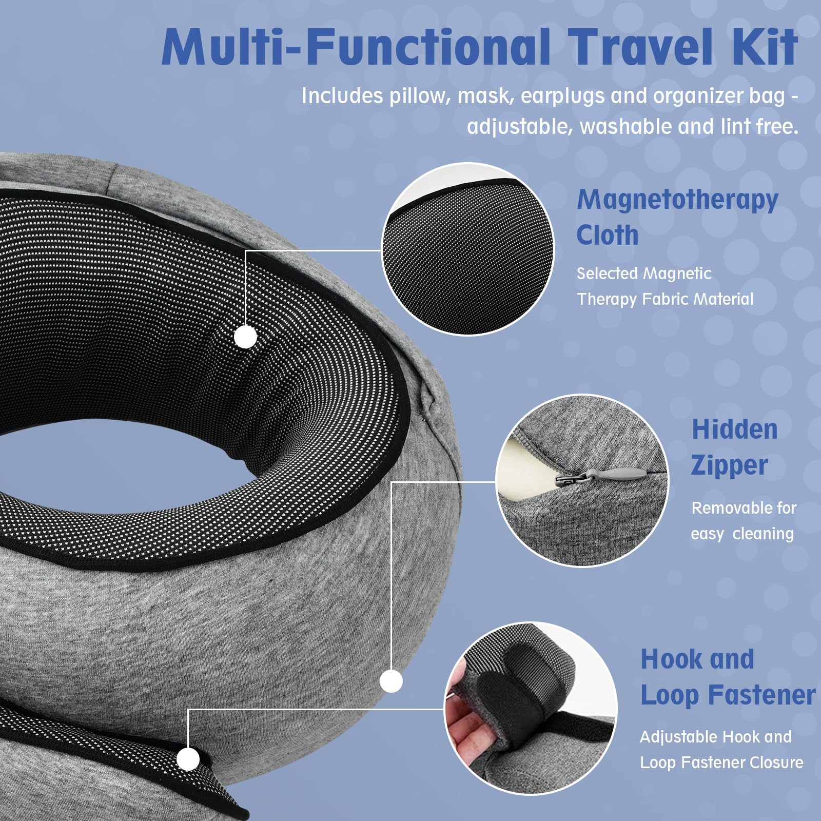 Description du produit Spécifications : Produit : Oreiller cervical intégré, oreiller en forme de U avec capuche Couleurs : Gris, Gris foncé Matériau : Coton doux, éponge haute résilience Matériau de l’éponge : Mousse à mémoire de forme 60D, douce et offrant un bon maintien, avec une bonne résilience Nettoyage : Amovible, facile à nettoyer L’ensemble comprend : Oreiller cervical intégré, masque pour les yeux, bouchons d’oreilles, sac de rangement Convient pour : Utilisation en avion, en voiture, au bureau ou à la maison Comprend un coussin de nuque intégré, un masque pour les yeux, des bouchons d'oreilles et un sac de rangement, offrant tout le nécessaire pour un voyage ou une sieste reposants Avantages : Matériau confortable et offrant un bon maintien Fabriqué en coton doux et en éponge haute résilience, cet oreiller cervical offre confort et soutien pour une expérience reposante. Idéal pour offrir en cadeau Cet ensemble complet est un excellent cadeau pour les voyageurs, les employés de bureau ou toute personne ayant besoin d'un accessoire relaxant. Ultraléger et compact : L'ensemble complet comprend un oreiller cervical tout-en-un, un masque pour les yeux, des bouchons d'oreilles et un sac de rangement. Masque Yeux Bouchons Oreilles Inclus Coussin D'Avion, Cou En Mousse À Mémoire Forme Pour Le Vol Coussin De Voyage Avion Flysmart Mousse à mémoire de forme 60D La mousse à mémoire de forme 60D est douce et offre un bon maintien, avec une bonne résilience, garantissant une bonne tenue et un soutien constant au fil du temps. Capuche intégrée : Notre oreiller cervical est doté d'une capuche douce qui recouvre votre nez, s'enroule facilement et se glisse dans le compartiment intégré, vous assurant un sommeil paisible à chaque instant. Installation sécurisée : Grâce à la fermeture auto-agrippante astucieuse, les extrémités de l'oreiller se chevauchent, maintenant votre tête et votre cou en position pour éviter tout basculement vers l'avant. Conception à capuche L’oreiller en forme de U avec capuche offre une couverture et une protection supplémentaires, contribuant à bloquer la lumière et le bruit pour un sommeil plus réparateur. Coussin de Voyage et Oreiller pour la Voiture et l'Avion à pas cher Facile à nettoyer Son design amovible facilite le nettoyage et l'entretien, garantissant ainsi une hygiène et une fraîcheur optimales. L'oreiller cervical se range dans le compartiment de voyage intégré, est ultra-léger et toujours à portée de main : idéal en avion, en voiture, au bureau ou à la maison