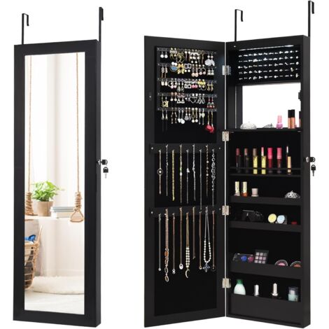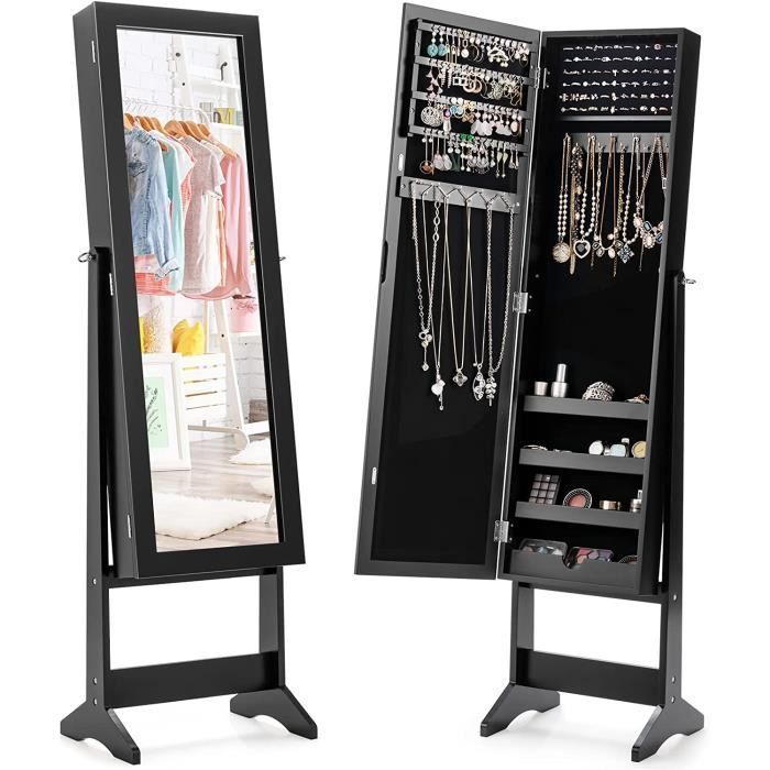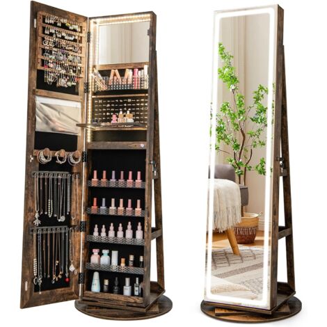 Armoire à Bijoux avec Miroir sur Pieds, Verrouillable, avec 6 LED, Rangement Bijoux Pivotant à 360°, Miroir Psyché sans Cadre, 3 Étagères de Rangement, Blanc ★ARMOIRE BIJOUX 4-EN-1★ Ce meuble bijoux combine un miroir sur pied, une armoire à bijoux, un miroir de vanité intérieur et une étagère de rangement, vous permettant de stocker tous vos essentiels dans un espace compact. Miroir Bijoux Sur Pied Avec éclairage RELAX4LIFE Armoire à Bijoux Pivotante à 360º Avec Miroir Sur Pieds Meuble Dressing Organisateur Armoire à Bijoux Rotative, Armoire à Bijoux Rotative, Armoire à Bijoux Mobile ★CONCEPTION SÉCURISÉE★ Notre miroir bijoux sur pied est équipé d’une charnière métallique robuste et d’une porte verrouillable pour une durabilité longue durée et une sécurité élevée. De plus, la doublure en velours luxueux offre une protection contre les rayures pour votre collection de bijoux . BASE PIVOTANTE À 360°★ Dotée d'une base pivotante à 360°, cette armoire à bijoux offre une grande flexibilité pour répondre à vos divers besoins. De plus, le design pivotant facilite l'accès à vos essentiels et vous offre la position parfaite pour admirer votre image de reflet Sogeshome armoire à bijoux avec miroir sur toute la longueur et étagère En outre, le miroir cosmétique à l’intérieur est également éclairé par les bandes LED de 3 couleurs pour faciliter le maquillage. Elle peut servir de coiffeuse temporaire en cas de besoin. La luminosité est variable par un appui long sur l’écran tactile.
