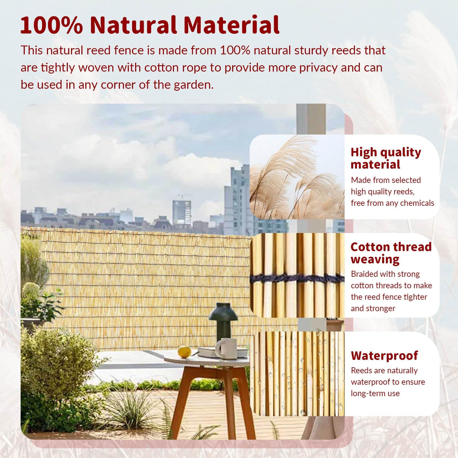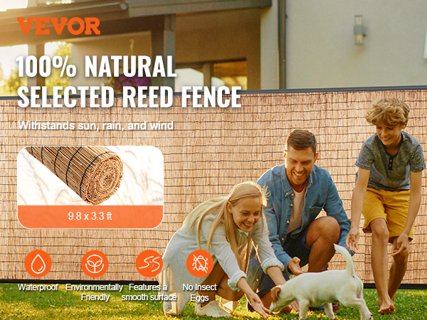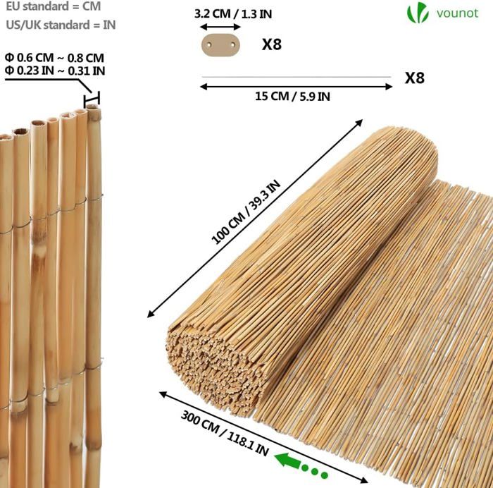 Brise Vue Jardin 1m VEVOR Cloture En Lattes De Bambou Naturel, 6 X 0,9 M, Brise-vue De Confidentialite, Rouleau De Protection Decoratif En Bambou, Pour Intimite Dans Jardin, Arriere-cour, Balcon, Patio, Bord Pour une installation en douceur, nous vous recommandons de porter des gants car il peut y avoir de légères bavures sur la surface. Brise vue en roseau naturel VOUNOT - 100x600cm - épais et solide... Nos clôtures en roseaux sont fabriquées à partir de roseaux de haute qualité, naturellement imperméables et durables. Entièrement pelés pour réduire la pourriture, ces matériaux s'intègrent parfaitement à votre espace extérieur, ajoutant une ambiance naturelle La lumière et l'air peuvent toujours passer, parfait pour lire ou d'autres activités tout en gardant les choses au frais. Que vous souhaitiez cacher un vieux mur, améliorer l'intimité de votre jardin ou de votre balcon, ou l'utiliser comme tapis ou rideau d'été, il s'intègre parfaitement. Clôture en roseau pour aménagement paysager de jardin, store d Une personne peut facilement fixer la clôture à n'importe quel rail ou poteau. SpécificationsNuméro du modèle de l'article : LLWL9833NQuantité : 1 ensembleTaille du produit : 9,8 x 3,3 pi/3 x 1 mCouleur : bois naturelMatériau : 100 % roseau naturelRuban à tisser : corde en cotonPoids du produit : 3,7 lb/1,7 kg ± 5 %Contenu du Colis1 x clôture en roseaux100 x attaches zippées noires1 x manuel d'utilisation Elle est propre et lisse, sans restes de feuilles ou de branches. Cette clôture en roseau est naturellement imperméable et très durable, ce qui en fait un excellent choix pour des années d'utilisation. De plus, elle ne contient pas d'œufs de vers, vous n'avez donc pas à vous soucier de la pourriture. Installation facile : ce kit comprend un panneau de clôture en roseau naturel 3 x 1 m et 100 attaches zippées. Les bords sont étroitement liés pour éviter les fissures, ce qui permet à votre clôture de rester parfaite. Roseau naturel pur : notre clôture en roseau est fabriquée à partir de roseaux naturels de haute qualité, entièrement pelés.