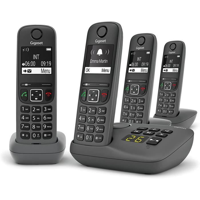 L’utilisation de ce produit est uniquement compatible en France Gigaset C575A - Téléphone sans fil avec répondeur Gigaset C575A - Téléphone fixe sans fil avec répondeur intégré jusqu'à 30 minutes d'enregistrement, grand écran rétro-éclairé couleur, fonctions mains libres et blocage d'appels - Noir Repertoire jusqu'à 200 contacts, avec nom, prénom, ainsi que 3 numéros de téléphone pour chacun. Mode Jumbo permettant d'agrandir les caractères et touches éclairées bien espacées, le Gigaset C575 est extraordinairement lisible et pratique, et est doté d'une acoustique optimisée pour une qualité sonore exceptionnelle Gigaset C575A & casque duo : communication pro simplifiée Les touches de numérotation rapide permettent d'appeler les contacts favoris sans avoir à composer de longs numéros ni parcourir tout le carnet d'adresses Fonction Blocage des appels anonymes garantissant la tranquillité à la maison : les appels anonymes s'affichent sans sonnerie ou peuvent être totalement bloqués – pour ne pas vous déranger. Téléphone Avec Répondeur Intégré Gigaset C575 - Téléphone Fixe Sans Fil Avec Grand écran Rétro-éclairé Couleur, Fonctions Mains Libres Et Blocage D'appels - Noir [Version Française Téléphone Allemand Grand écran Rétroéclairé