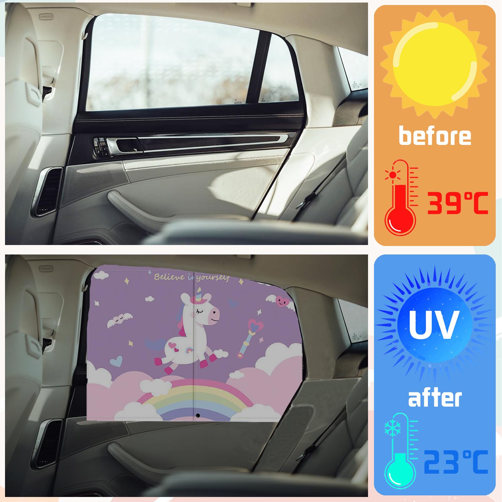 Pare-soleil Arrière Voiture Enfants Pare Soleil Voiture Bébé, 2 Pièces Rideau Pare-Soleil De Voiture Avec Aimants, Animaux Pare-Soleil, Fournit Une Protection Uv Ma - Auto Accessoire Bébé Voiture UV Vous pouvez voir clairement la forme de la voiture, mais il est difficile de voir l'intérieur de la voiture de l'extérieur. Pare-Soleil de Fenêtre de Voiture pour Renault Koleos 2008-2016,Bloquer... Non seulement vous pouvez bloquer les rayons UV, mais vous pouvez aussi baisser les fenêtres à tout moment pour que votre famille, vos amis et vos animaux domestiques puissent profiter de la brise fraîche pendant que vous conduisez Veuillez mesurer la taille de la lunette arrière de votre voiture avant l'achat La conception pliable permet un rangement facile dans la boîte à gants de votre véhicule Pare-Soleil Vitre de Voiture – ZATOOTO pour Vitres latérales(2 Pièce Protégez Votre Vie Privée - Le pare-soleil pour fenêtre de voiture créera une pièce d'intimité pour les passagers du siège. Rejetez la température élevée dans la voiture. Vous aider à faire la sieste et à regarder des vidéos dans la voiture sans soleil éclatant. Taille Universelle plus Grande - Taille 30 pouces X 20 pouces pour la lunette arrière, plus grande que les autres sur le marché, convient à la plupart des véhicules, voitures, SUV, camions, fourgonnettes, fourgonnettes, camionnettes et toutes les grandes fenêtres telles que celles à l'intérieur de votre maison, peuvent être rétractées pour le côté de la porte lorsqu'il n'est pas utilisé. C'est comme un synonyme de bonheur et de beauté, et la licorne transmet la beauté au monde. Rejeter la Protection Contre les Reflets du Soleil et les Rayons UV - Fabriqué en tissu maillé de haute qualité mis à jour, protège au maximum vos enfants et votre animal de compagnie dans la voiture arrière contre les rayons UV nocifs et les reflets du soleil, réduit la chaleur et empêche vos enfants de se brûler ou de surchauffer, et maintient également la respirabilité et la vie privée Garde votre voiture au frais et confortable pendant la conduite Abaisser la température intérieure de la voiture, vous faire sentir au frais et à l'aise pendant les longs trajets en voiture Pliable et portable Le tissu à mailles fines est doux et léger sans sacrifier la visibilité, ce qui lui permet d'être soigneusement rangé à l'intérieur de votre voiture lorsqu'il n'est pas utilisé Facile à installer Retirez simplement les pare-soleil, attachez l'aimant de rideau au cadre de fenêtre de voiture en métal, terminé !