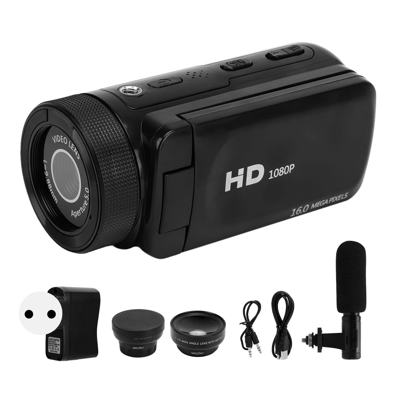 Caméscope HD 1080P, Caméra Vidéo 16MP, Caméra de Vlogging avec écran TFT 2,4 Pouces à Rotation de 180 Degrés, Objectif Grand Angle 0,45X, avec Microphone à Réduction de Bruit (Prise UE Il prend également en charge la pause d'enregistrement et peut servir de caméra d'ordinateur, ce qui rend votre utilisation plus pratique. Micro Réduction Bruit Caméscope Vidéo, Caméra Vidéo 16 MP 1080p Avec Microphones, Zoom Enregistrement Vidéo Grand Angle Dans l'interface d'enregistrement vidéo, appuyez sur le bouton « MENU » pour accéder aux paramètres. L'objectif grand angle peut être démonté en un objectif macro, ce qui vous permet de prendre des photos à courte portée. Le fond a un trou de vis 1/4, qui peut être utilisé avec différents trépieds. Caéscope 4K 64P HD Écran Tactile 18X Zoo Nuérique Autofocus... Caméscope numérique HD 16 MP, 1080P, écran LCD TFT 2,4 pouces pivotant ADAPTÉ POUR : Cet appareil photo convient aux enregistrements de croissance de bébé, aux voyages, aux mariages, aux enregistrements de campus, etc. RÉSOLUTION HD 1080P: L'appareil photo numérique prend en charge la prise de photos 16MP et l'enregistrement vidéo haute définition 1080P. Liste des colis :1 x appareil photo1 x câble USB2 x instructions Manuel1 x microphone1 x câble de connexion du microphone1 x objectif grand angle1 x prise