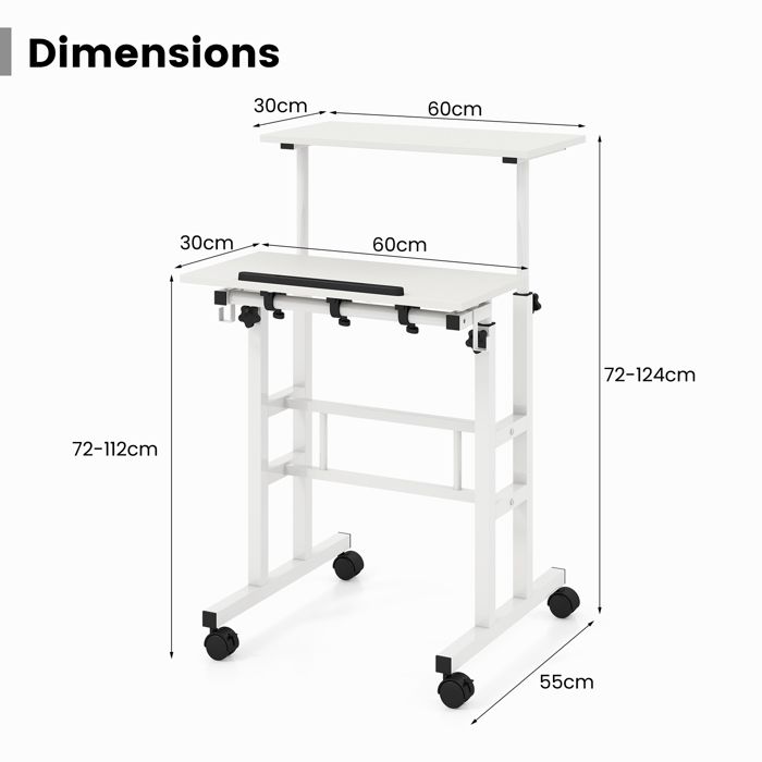 De plus, la butée antichute est conçue pour garantir que tout reste en place. Matériau : MDF + Métal Plateau spacieux et 2 crochets pratiques pour une organisation facile bureau inclinable et réglable en hauteur NOC Cette fonctionnalité, combinée aux dimensions peu encombrantes de notre bureau debout, maximise l'efficacité de votre espace de travail même dans les zones les plus compactes. De plus, 4 roulettes universelles permettent un déplacement facile sur votre espace de travail : verrouillez les 2 roulettes pour plus de stabilité pendant que vous accomplissez vos tâches. 1 x Manuel d‘instructions Butée antichute garantit que votre livre ou ordinateur portable reste en place Largeur des pieds inférieurs : 55 cm # 𝐏𝐫𝐚𝐭𝐢𝐪𝐮𝐞 𝐏𝐨𝐥𝐲𝐯𝐚𝐥𝐞𝐧𝐭𝐞 # Grâce à la hauteur réglable et au plateau avant inclinable, ce bureau à roulettes est polyvalent et peut être utilisé comme bureau d'étude, bureau d'ordinateur ou pupitre. Avertissement De Sûreté Veillez à verrouiller les roulettes pour une stabilité accrue lors de l'utilisation du bureau. GYMAX Bureau Assis-Debout à roulettes Verrouillables, Hauteur Réglable Hauteur de la base : 9 cm Table De Lit Medical Bureau Assis-debout Mobile Bureau Roulant Réglable En Hauteur Avec Bureau Mobile Description du produit À Propos de l'Article Élevez votre espace de travail avec notre bureau assis-debout réglable en hauteur. # 𝐂𝐨𝐦𝐛𝐢𝐧𝐚𝐢𝐬𝐨𝐧 𝐒𝐭𝐚𝐛𝐢𝐥𝐢𝐭é-𝐌𝐨𝐛𝐢𝐥𝐢𝐭é # Doté d'un cadre en métal robuste, ce bureau assis-debout roulant assure une excellente stabilité et une utilisation à long terme. Infos Détaillées Couleur : Marron/Naturel La construction en métal robuste offre de la stabilité, et 4 roulettes universelles facilitent le déplacement. Utilisez-le comme bureau pour ordinateur portable, pupitre ou bureau d'accueil pour une fonctionnalité polyvalente. Il est parfait pour une variété d'activités telles que la lecture, le dessin, le travail ou même les conférences. # 𝐑é𝐠𝐥𝐚𝐠𝐞 𝐄𝐫𝐠𝐨𝐧𝐨𝐦𝐢𝐪𝐮𝐞 𝐝𝐞 𝐇𝐚𝐮𝐭𝐞𝐮𝐫 # Le plateau avant peut être réglé de 72 à 112 cm et l'autre plateau latéral de 72 à 124 cm. 2 Roulettes verrouillables sont conçues pour une stabilité supplémentaire Capacité de poids du plateau (levage) : 20 kg, Poids net : 10 kg Présentation du pupitre mobile polyvalent et élégant, conçu pour améliorer votre image professionnelle dans n'importe quel environnement, de votre bureau à domicile à la salle de classe Traits Dominants Conception du bureau assis-debout peut éviter l'inconfort du travail sédentaire Largement utilisé comme bureau d'étude, bureau d'ordinateur ou pupitre Le Colis Comprend 1 x Bureau assis-debout # 𝐁𝐮𝐫𝐞𝐚𝐮 𝐀𝐯𝐚𝐧𝐭 𝐈𝐧𝐜𝐥𝐢𝐧𝐚𝐛𝐥𝐞 # Ce pupitre pour ordinateur portable dispose également d'un bureau avant inclinable qui permet de positionner facilement votre appareil à l'angle parfait pour un confort et une facilité d'utilisation améliorés.