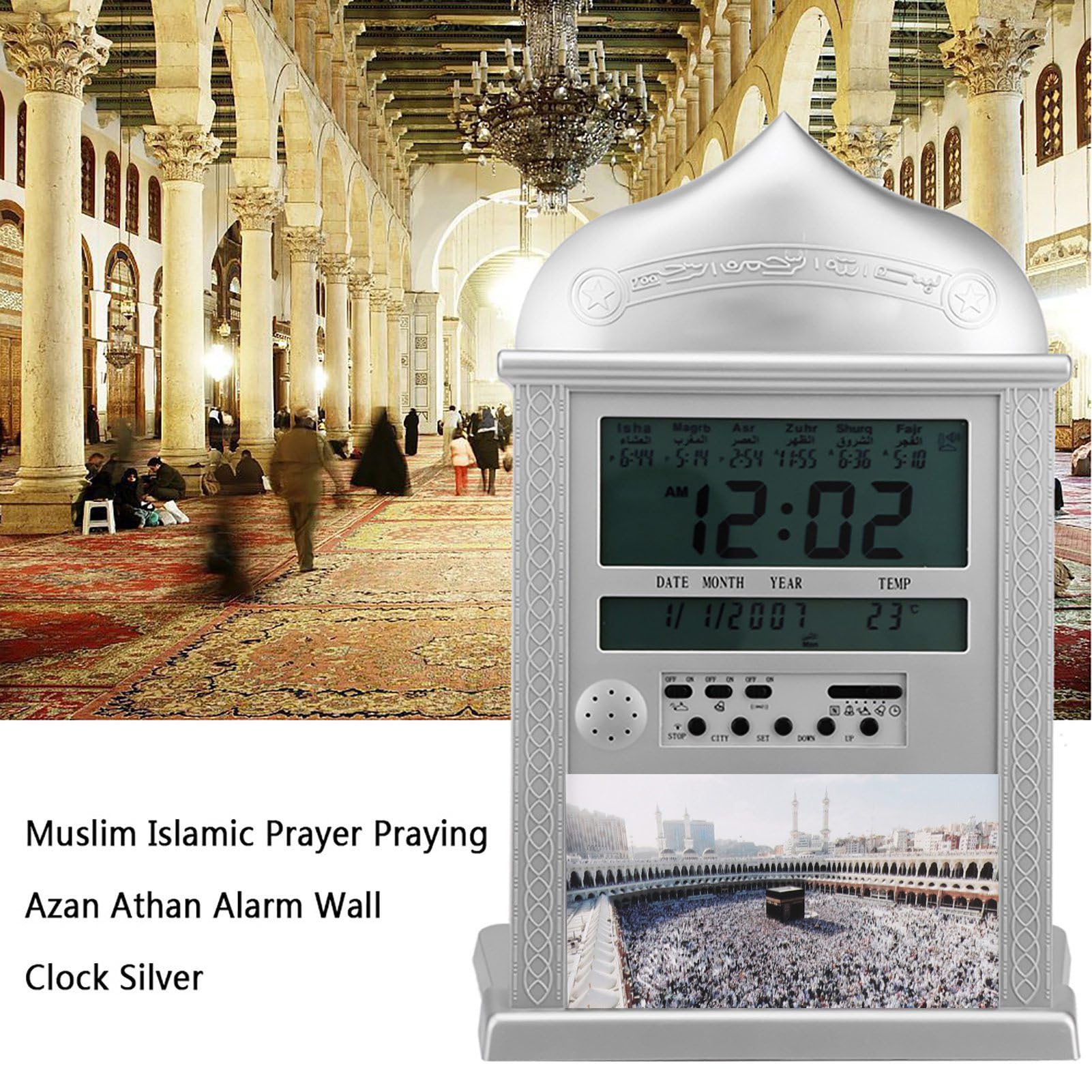 Caractéristiques : * Heure mondiale sélectionnable : choisissez parmi 1500 villes à travers le monde pour afficher leur heure. Montre de prière avec calendrier Hijri - Babsalla Produits * Écart de temps de prière réglable : chaque jeu de temps de prière peut être ajusté, et l'heure de prière peut être désactivée si vous le souhaitez. Contenu de l'emballage : horloge. Élégante décoration d'intérieur : fabriquée avec un cadre en plastique et un miroir en verre en finition or ou argent, cette alarme Moskee Kalender Moslim Gebed Wandklok se marie avec le décor Ramadan Hom et les espaces de vie quotidiens. Achetez en gros Horloge De Prière Musulmane Al Fatiha Avec Réglage Automatique De L'heure, Calendrier Hijri Grégorien, Rétroéclairage Led, Horloge Azan De Bureau Chine et Horloge De Prière Musulmane à 9 USD * Fonction snooze : vous permet de faire une pause pendant 5 minutes supplémentaires. Affichage de l'heure mondiale sélectionnable : vérifiez rapidement l'heure exacte pour 1500 villes du monde, ce qui le rend pratique pour planifier vos voyages, rester en contact avec vos proches à l'étranger et maintenir des routines quotidiennes en temps opportun. Double alarme et fonction snooze : choisissez entre des alarmes uniques ou récurrentes ; réveillez-vous avec un son de tic-tac et profitez d'une répétition de 5 minutes pour des démarrages doux du matin ou des rappels importants. * Fonction de température : affiche la température en degrés Celsius et Fahrenheit, avec la possibilité de basculer entre les deux échelles. Horloge De Prière Réveil Islamique Azan L'Horloge Multi-Fonctionnel Réveil Numérique Automatique * Dimensions : 330 x 205 x 27,2 mm., Couleur : doré, argenté. Montre avec Hijri Calendrier et Heure De Prière Fajr - Test et Avis