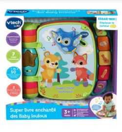 Le visage sur la reliure s’illumine lorsque Bébé tourne les pages. Vendu Livre interactif Mon super livre enchante. Marque : VTECH. Le nouveau super livre enchanté rose est un livre interactif pour écouter des comptines célèbres en compagnie d'animaux rigolos. Bébé va partir Dans ce pack vous découvrirez 2 superbes jeux d’éveil de la marque Vtech : - Mon super livre enchanté, un livre interactif contenant de nombreuses activités Descriptif Produit : Un livre interactif avec 7 pages illustrées, 6 comptines françaises chantées. Dimensions : 17 x 4,7 x 18 cm Le livre chante les comptines et votre enfant mémorise visuellement des sons et chansons en s'amusant. Touches mobiles et interactives sur chaque page d'histoire A chaque page, des objets cache-cache à manipuler pour déclencher les chansons ou des effets sonores amusants. Avertissement De Sûreté a partir de 6 mois, Age Minimum : 6 mois Livre Musical Comptines Do, R, Mi, Supr Livr Nchant Modèl Aléatoiris Au Livre Musical Enfant 6 Mois
