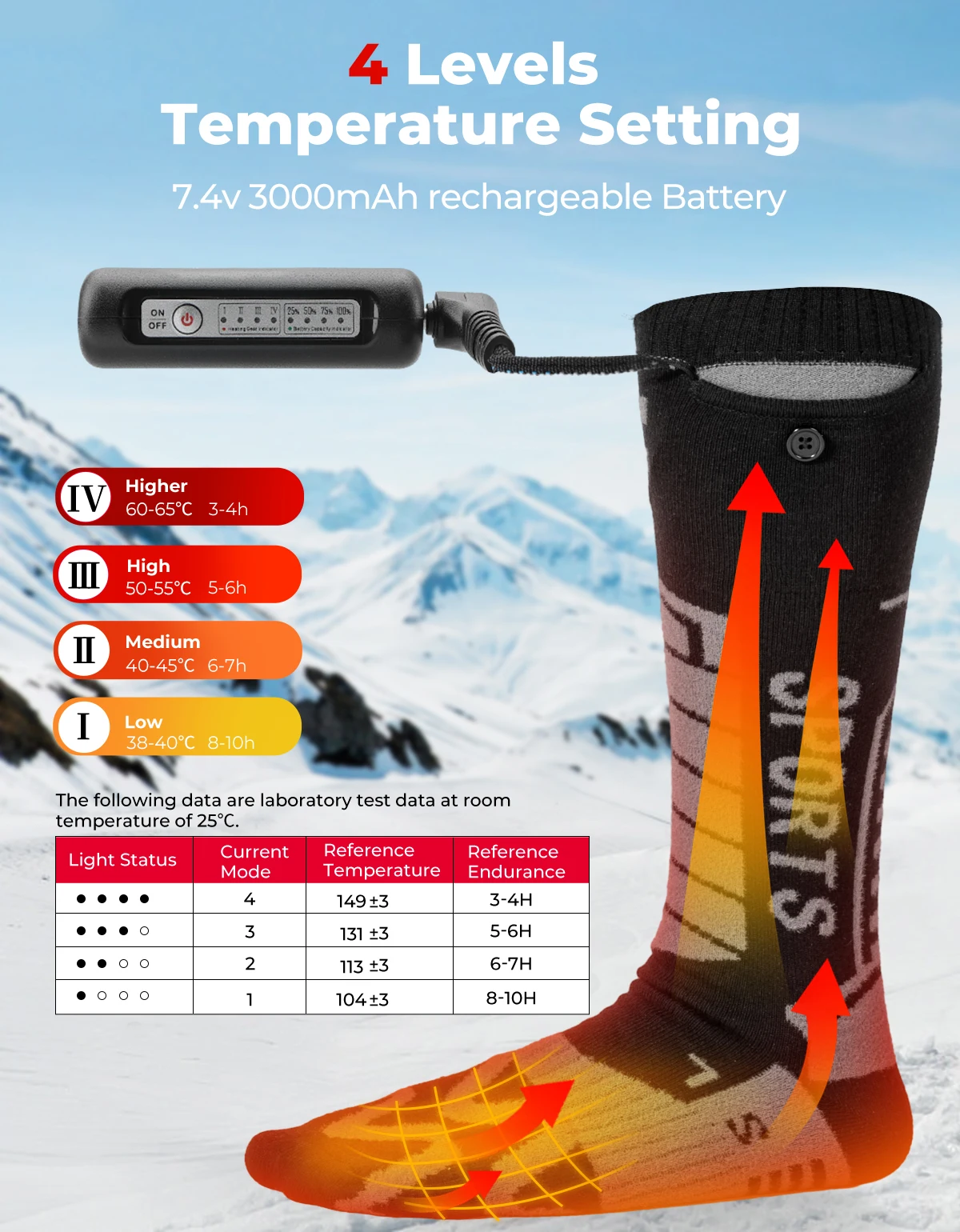 🧦 Maxi confort et taille universelle: Avec une excellente élasticité et un confort optimal, ces chaussettes chauffantes s’adaptent parfaitement à différentes tailles de pieds. Idéales pour les hommes, les femmes et même les mamans par les temps froids. Chaussettes électriques USB 5000mAh Chaussettes Chauffantes, 5000mAh Chaussette Chauffante USB Chaussettes Chauffantes 5000mAh Chaussette Chauffante avec Batterie 5000mAh, Chaussettes Elles conviennent aussi bien aux hommes qu’aux femmes, et constituent un cadeau attentionné pour les mamans. Dotées d’un design universel, elles sont un incontournable pour quiconque veut garder les pieds chauds cet hiver. 🔥 Couverture chauffante étendue et lavable: Ces chaussettes électriques disposent d’éléments chauffants larges, enveloppant vos pieds complètement pour une chaleur continue. Elles acceptent le lavage à la main et en machine – il suffit de retirer la batterie au préalable. Batterie Améliorée]La nouvelle version des chaussette chauffante avec batterie 5000mAh, grande capacité pour répondre à vos besoins pour les activités de plein air, et il n'y a pas besoin de recharge fréquente pour une utilisation à long terme 🔋 Batterie 5000mAh pour chaleur durable: Dotées d’une batterie rechargeable haute capacité de 5000mAh, ces chaussettes chauffantes assurent une chaleur fiable jusqu’à 10 heures au niveau de chauffe le plus bas. Poids avec emballage : 500g Taille de l’emballage : 18., 5*7., 5*10cm Chaussettes Chauffantes, 5000mAh Chaussette Chauffante USB Rechargeable Électrique pour Hommes Femmes, 4 Niveaux Chauffage Chaussettes d'hiver Coton pour Sports - Ski Cyclisme Moto 📱 Contrôle via APP et utilisation simple: Ces chaussettes chauffantes sont équipées de la fonction Bluetooth APP, permettant de régler la température en douceur – vous maîtrisez entièrement votre confort.