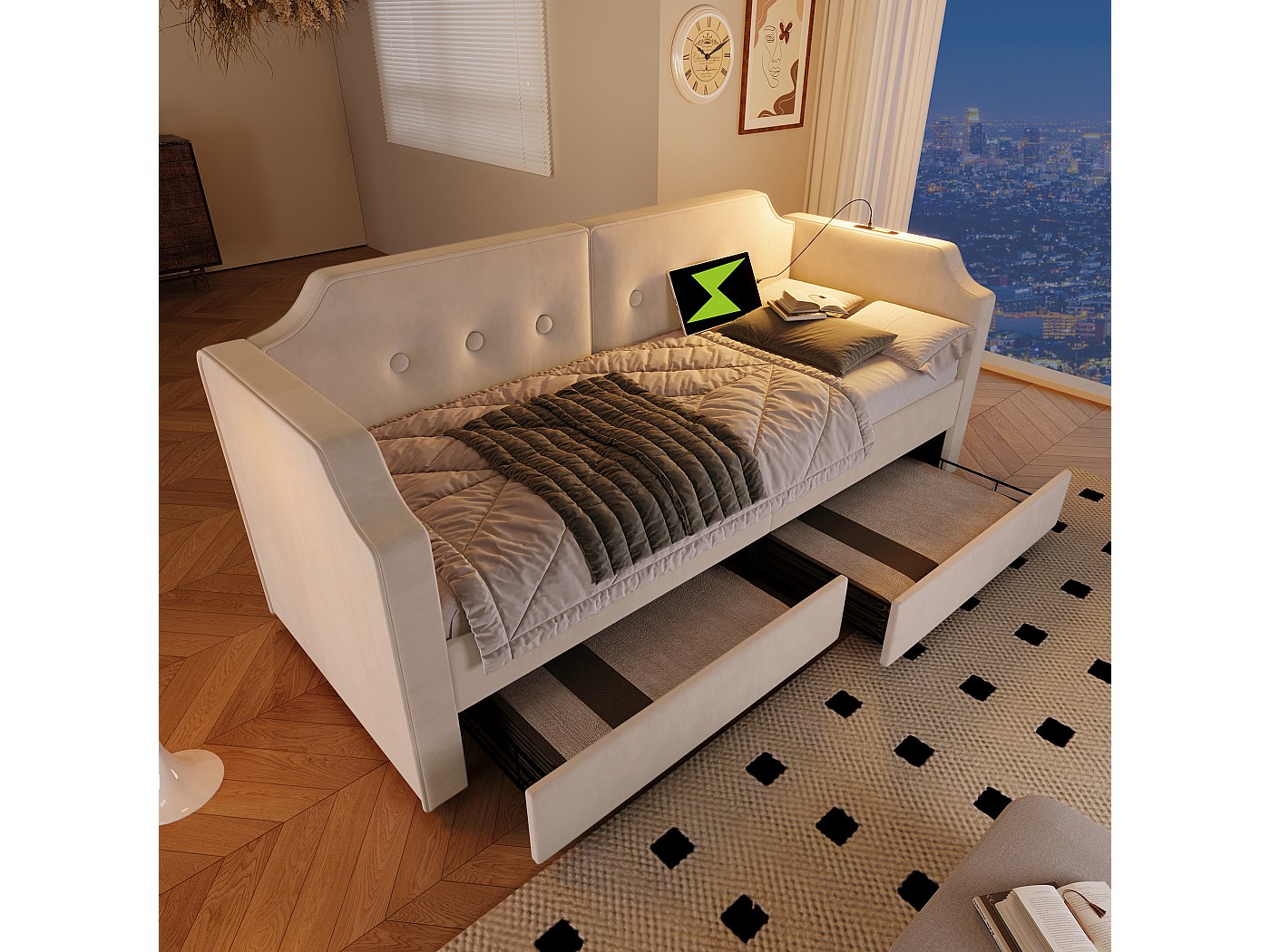 Artswish Canapé Lit 90/180x200 cm, Canapé Convertible 2-en-1 avec Station de Chargement USB & Type-C, Lit d'Appoint Confortable et Canapé Jour pour Petits Espaces, Velours Gris (sans Matelas Avec ses solutions de stockage intelligentes, ses technologies intégrées et son design raffiné, ce lit coche toutes les cases pour transformer votre chambre en un havoir d'organisation et de sérénité. Canapé Lit 2 Places OOIILLEE Canapé Lit 90/180 X 200 Cm Avec LED Et Prises USB, Gigogne De Même Hauteur, Canape Lit 2 Places Convertible Avec Compartiments De Rangement, Cadre (sans Matelas Canapé-lit Rangement USB Deux spacieux tiroirs intégrés accueillent vos affaires personnelles pour une chambre toujours bien rangée. Le mariage de ces matériaux assure une longévité exceptionnelle et un confort apaisant pour les années à venir., 2., Gain de place astucieux, optimisation maximale Avec ses compartiments rabattables et ses étagères intégrées, ce lit maximise l’espace sans encombre. Idéal pour ranger et organiser vos affaires, il garde votre chambre toujours bien ordonnée., 3., Découvrez notre tête de lit capitonnée au design unique, où l'élégance rétro rencontre le confort moderne. Canapé lit avec deux tiroirs collection ZITO 90x200 cm coloris gris... TRU Lit Simple pour 90 x 200 cm Lit de jour en Bois de pin massif avec Plusieurs surfaces de rangement stratégiquement disposées gardent vos livres, lunettes et objets du quotidien à portée de main. Une invitation à adopter l'art de vivre moderne !, 1., Matériaux écologiques, qualité supérieure Composé de tissu de chanvre respirant et de panneaux MDF durables, ce lit allie naturel et robustesse. La tête de lit capitonnée main, agrémentée de boutons traditionnels, apporte une élégance rétro tout en offrant un confort ergonomique.