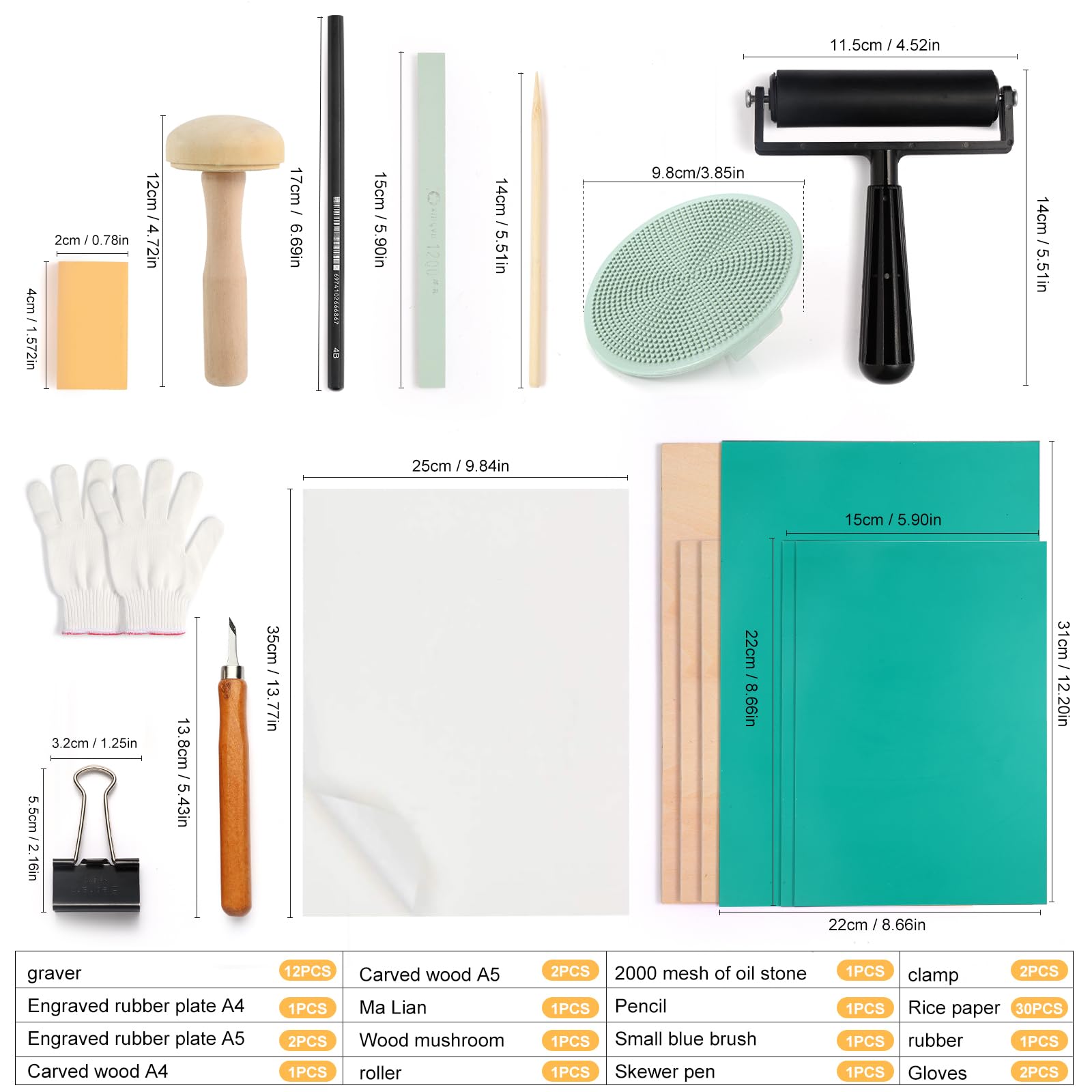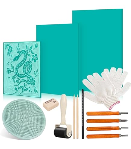Les mesures étant prises à la main, les tailles indiquées peuvent varier de 1 à 2 cm. Idéal pour de nombreux matériaux : Notre ensemble de sculpture est spécialement conçu pour les blocs souples, le caoutchouc et le linoléum, ce qui le rend parfait pour créer des tampons en caoutchouc, des sculptures et même des sculptures de citrouilles uniques Le kit de découpe en linoléum est utilisé comme suit : Motif : dessinez des motifs avec un crayon sur la plaque d'impression lino et retirez l'excédent de lignes avec une gomme. Scénario d'application : le kit de sculpture linoléum est parfait pour les débutants, les artisans et les étudiants pour créer du linoléum, pas besoin d'acheter des outils supplémentaires, utilisez le kit d'impression linoléum pour créer votre propre style d'impression monochrome, impressions multicolores, tampons, timbres, cartes de vœux faites à la main, affiches d'art, peintures décoratives et autres œuvres d'art, laissez libre cours à votre créativité et à votre imagination. L'impression est pratique et efficace : il n'est pas nécessaire d'appuyer et de teindre à la main, le clip maintient le papier pour éviter les mouvements, le papier d'impression linoléique à imprimer est roulé avec un rouleau d'impression lino avec une poignée confortable, il est facile de colorer uniformément sans appuyer fortement, et si la coloration n'est pas assez complète, vous pouvez également utiliser un rouleau presseur ou un rouleau de mushroom pour presser et peindre, ce qui vous permet de gagner du temps. Petit pinceau bleu, 1 Crayon en bambou, 2 clips, 30 papiers d'impression lino, 1 gomme, 2 gants, le kit de coupe en ligne est complet et le nombre est suffisant, c'est l'outil idéal pour la fabrication de linoléum. Vous pouvez facilement commencer à expérimenter la sculpture des deux matériaux, le linol peut être libre de faire soi-même avec un stylo de peinture et peut être coupé pour créer des tampons uniques. Plaque de linoléum prémontée sur bloc Inspection et coupe : vérifiez et coupez les détails une fois terminé et affinez le design avec un stylo en bambou. Lot de 6 outils de sculpture de cire en acier inoxydable à double Kit Impression Linogravure Lot De 31 Outils De Sculpture De Linoléum - Kit De Démarrage Outils Sculpture Lino 31 Pièces Plaques A5 A4 Débutant Liste de colisage : le kit d'impression de lino contient 12 outils de découpe de lino, 2 plaques de linoléum colloïde A5 et 1 plaque d'impression de linoléum colloïde A4, 2 plaques de linocut en bois A5 et 1 plaque de linolium en bois A4, 1 rouleau de pression robuste, 1 rouleau champignon, 1 rouleau de 10 cm, 1 pierre à huile, 1 crayon, 1 rouleau champignon. Préparation de l'impression : utilisez un petit pinceau pour couvrir uniformément la surface de gravure avec l'encre et le papier de riz pour couvrir la plaque de linoléum alignée. Retirez l'empreinte : retirez délicatement le papier de riz après le transfert d'encre pour éviter les taches. 12 outils de sculpture en linoléum. 2 plaques de lino colloïde A5, 1 plaque de lino colloïde A4., 2 pièces de linol en bois A5, 1 linol en bois A4., 2 pinces., 2 gants.