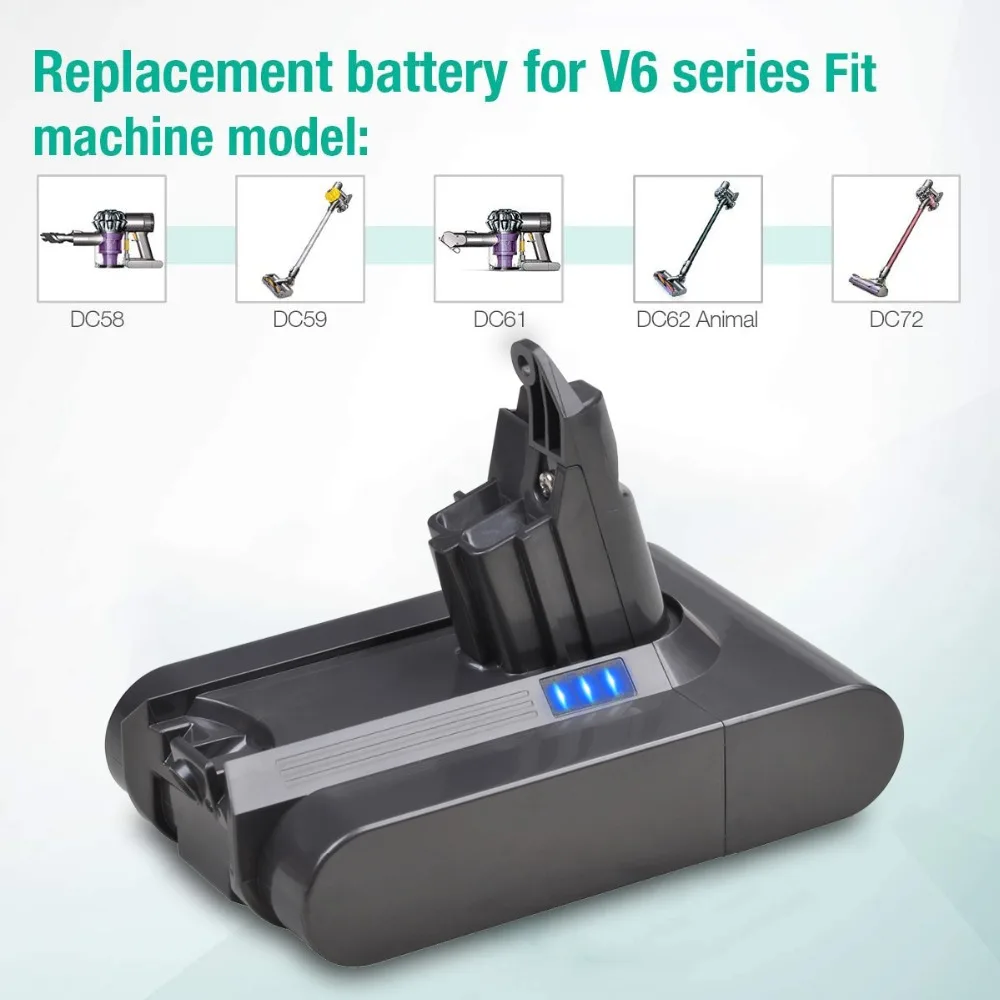 La batterie V6 utilise des cellules de la plus haute qualité, sûres avec la technologie de charge rapide tout en offrant une protection contre les surcharges, les surintensités, les courts-circuits, les surcharges et les températures élevées pour vous assurer que vous pouvez utiliser l'aspirateur en toute sécurité. Si la lumière ne s'allume pas ou clignote en rouge lors du chargement de la batterie, retirez la batterie de la machine et appuyez plusieurs fois sur l'interrupteur de la batterie pour continuer la charge. Vous pouvez également appuyer sur l'interrupteur de la machine d'aspirateur jusqu'à ce que la lumière rouge s'éteint. Batterie DC62 SV03 DC58 Batterie Pour Dyson V6 DC62 DC58 DC59 DC61 DC72 DC74 SV03 SV05 Sv06 Sv07 Sv09 Aspirateur Li Ion 216v 6400mah 82133274 Dyson 21.6V 2800mah 65wh Battery Replacement Batterie de Rechange pour Dyson V6, 6500 mAh, Compatible avec V6 Animal Absolute SV03 SV04 SV05 SV06 SV07 SV09 DC58 DC59 DC61 DC62 DC72 DC74 avec filtres et Tournevis 885 résultats trouvés pour votre recherche Batterie Dyson DC62 sur le comparateur de prix AMICROSS Batterie de rechange 21,6 V 4,5 Ah pour Dyson V6, installation