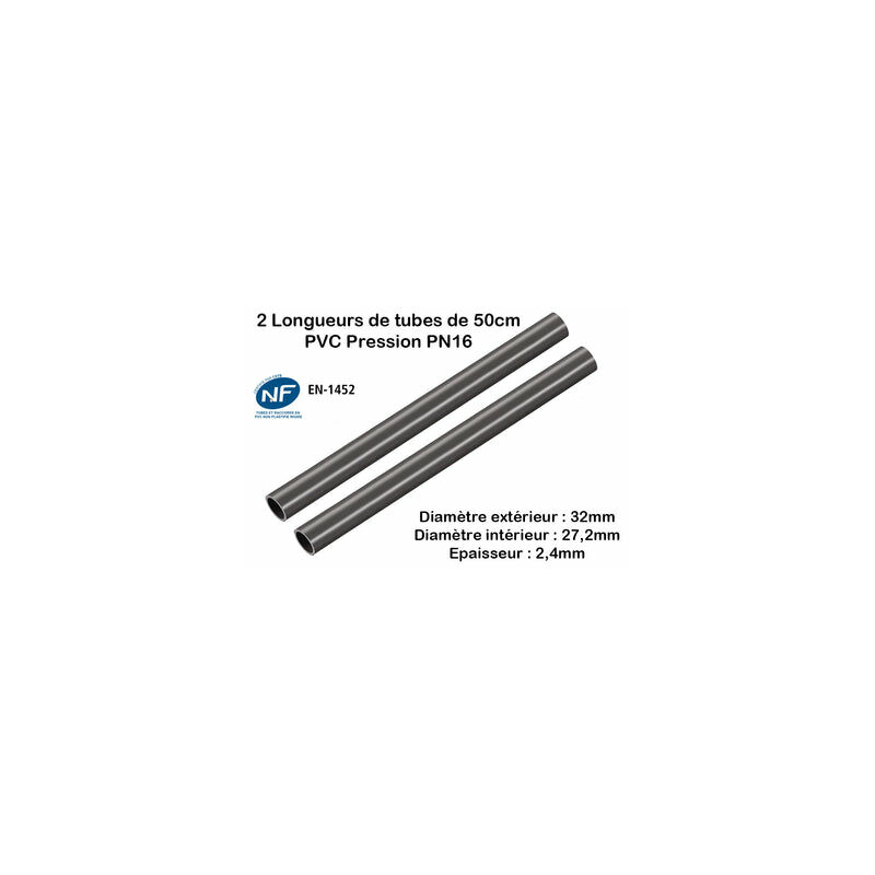 Résistant aux produits de piscine Surfaces intérieures et extérieures totalement lisses Lot de 3 Barres Tuyau Rigide Tube PVC PN10 50mm D50 : Longueur 2m / PVC-U Diamètre extérieur : 50mm / Diamètre intérieur 45,2mm / Epaisseur Tuyau : 2,4mm Longueur du tube à coller : 2m Fabriqué en ITALIE / Norme NF EN-1452 / Compatible pour une utilisation en piscine ou évacuation. Diamètre extérieur : 50mm / Diamètre intérieur 45,2mm / Epaisseur Tuyau : 2,4mm Tuyau Pvc Tube PVC Pression Diamètre 50mm - 1m - Norme EN1452 - PN16 Vanne Pvc 50 Tuyau Pvc 40mm Résistant aux produits de piscine Lot de 3 Barres Tuyau 50mm : Longueur 50cm Rigide Tube PVC Tube PVC Barre Tuyau Rigide Pression PN10 63mm : Longueur 1m | Leroy Merlin Barre PVC Lisse Intérieur Extérieur Les atouts Lot de 3 Barres Tuyau Rigide Tube PVC Pression PN10 50mm D50 : Longueur 1m PVC-U Diamètre extérieur : 50mm / Diamètre intérieur : 45,2mm / Épaisseur du tuyau : 2,4mm Longueur du tube à coller : 1m Fabriqué en ITALIE / Norme NF EN-1452 / Compatible pour une utilisation en piscine ou évacuation. Résistant aux produits de piscine