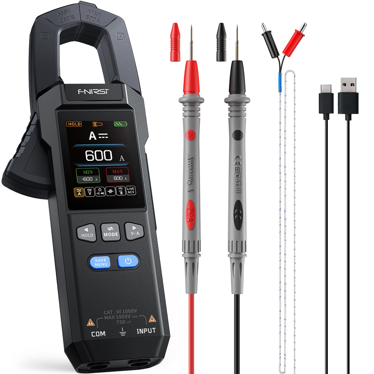 La pince ampèremètre a une mâchoire 00 de largeur, adaptée pour mesurer différents types de fils. Il est équipé d'une rétention de données, d'un indicateur de batterie faible, d'un arrêt automatique et d'une fonction de lampe de poche, prenant en charge 10 niveaux de réglage de la luminosité Équipé d'une interface utilisateur professionnelle, prend en charge l'analyse de courbe de données et l'affichage de la valeur maximale/minimale. Multimètre Numérique FNIRSI DMC-100 Pince Ampèremétrique Numérique, Multimètre TRMS 9999 Points, Enregistreur De Courbes 600A, Ampèremètre Rechargeable Avec Sac De Rangement, NCV, Tension CA/CC, Courant, Continuité Testeur Tension AC DC FNIRSI Pince multimètre numérique DMC-100 FNIRSI DMC-100, 10 000 points, courant max 600 A, mesure précise de la tension AC/DC, courant AC/DC, capacité, résistance, continuité, diode, fréquence, température et prend en charge NCV, détection de fil alimenté. C'est un outil idéal pour les professionnels et les électriciens à domicile. Portable et rechargeable : le testeur de tension dispose d'une batterie au lithium intégrée de 1500 mAh, prend en charge la charge rapide de type C, et a une longue durée de vie de la batterie pour répondre aux besoins d'une utilisation à long terme. Multimètre numérique 100 000 points Pince ampèremétrique CA CM86A 1 000 A, ampèremètre, multimètre/testeur Le mode de mesure de puissance intégré peut afficher simultanément la tension et la valeur actuelle pour une mesure efficace. La pince ampèremètre a une mâchoire 00 de largeur, adaptée pour mesurer différents types de fils. Le multimètre numérique FNIRSI prend en charge 8 ensembles de données en temps réel.