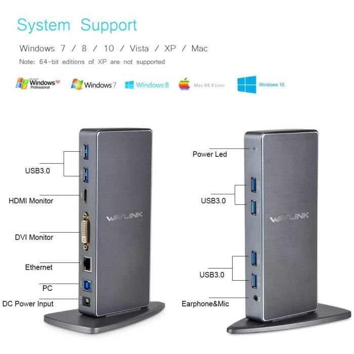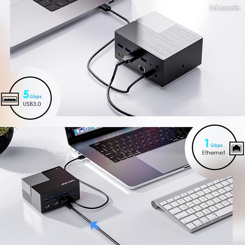 HDMI: 3840x2160@30Hz(DP1., 2); 3840x2160@60Hz(DP1., 4, without DSC); 3840x2160@60Hz(DP1., 4, with DSC) Dual Display:DP1+DP2: dual 3840x2160@30Hz(DP1., 2); dual 3840x2160@30Hz(DP1., 4, without DSC); dual 3840x2160@30Hz(DP1., 4, with DSC) DP1/2+HDMI: dual 3840x2160@30Hz(DP1., 2); dual 3840x2160@30Hz(DP1., 4, without DSC); dual 3840x2160@30Hz(DP1., 4, with DSC) Triple Display:DP1+DP2+HDMI: triple 3840x2160@30Hz(DP1., 2); triple 3840x2160@30Hz(DP1., 4, without DSC); triple 3840x2160@30Hz(DP1., 4, with DSC) - Un port RJ45 Gigabit Ethernet offre un réseau haut débit et est rétrocompatible avec les réseaux 10/100 Mbps. - MacOS ne prend pas en charge le MST, les 3 moniteurs externes afficheront le même contenu. De plus, 3 ports USB 3., 2 Gen 2 prennent en charge une vitesse de 10 Gbps pour une transmission de données ultra-rapide, soit 20 fois la vitesse d'un port USB 2., 0., 【Contenu de la livraison】En achetant nos produits, vous recevrez 1 station d'accueil USB-C à triple écran, 1 câble USB-C vers USB-C, 1 adaptateur secteur 130 W, 1 câble d'alimentation CA, 1 guide de démarrage rapide, 1 carte de téléchargement des pilotes et 1 notice de sécurité. Lorsque votre ordinateur hôte fonctionne sous Windows, la résolution peut atteindre deux 4K@30Hz+1920x1080@60Hz (DP1., 4, avec DSC) ; et la résolution prise en charge par les Macbooks peut atteindre trois 4K@30Hz. Charge 100W Ports Multiples WAVLINK Dock USB C, Stations D'accueil Pour Ordinateur Portable 12 En 1 à Triple Affichage Avec Dual 4K DP, 4K HDMI, 100W PD, Gigabit Ethernet, 2 Connectivité Complète Ordinateur Portable Remarque : veuillez vous assurer que le port USB-C de votre ordinateur portable prend en charge la charge. Cette station d'accueil USB-C à triple affichage est particulièrement adaptée aux Macs équipés d'un processeur Intel/M1/M2., 【Transfert de données à haut débit】Équipée de 3 ports USB 3., 0, cette station d'accueil offre un transfert de données à 5 Gbps vers vos appareils tels que souris, claviers et consoles de jeux. Windows--- Single Display:2xDP ports: 3840x2160@30Hz(DP1., 2); 3840x2160@30Hz(DP1., 4, without DSC); 3840x2160@120Hz(DP1., 4, with DSC) 【Triple affichage haute performance】Équipé de deux ports DP et d'un port HDMI, ce dock permet de connecter simultanément trois moniteurs HD, ce qui vous permet d'agrandir facilement votre poste de travail. Targus Station d'accueil hybride/universelle USB-C avec alimentation... Systèmes compatibles : Windows 10 ou version ultérieure, Mac OS 10., 15 ou version ultérieure (peut étendre un seul écran différent), Chrome OS, Android, Harmony OS, iPadOS, Linux HDMI port: 3840x2160@30Hz(DP1., 2); 3840x2160@60Hz(DP1., 4, without DSC); 3840x2160@60Hz(DP1., 4, with DSC) Dual Display:DP1+DP2: dual 1920x1080@60Hz(DP1., 2); dual 2560x1440@60Hz(DP1., 4, without DSC); dual 3840x2160@60Hz(DP1., 4, with DSC) DP1/2+HDMI: dual 1920x1080@60Hz(DP1., 2); dual 2560x1440@60Hz(DP1., 4, without DSC); dual 3840x2160@30Hz(DP1., 4, with DSC) Triple Display:DP1+DP2+HDMI: dual 1920x1080@30Hz + one 1280x720@60Hz(DP1., 2); triple 1920x1080@60Hz(DP1., 4, without DSC); dual 3840x2160@30Hz + one 1920x1080@60Hz(DP1., 4, with DSC) Mac OS---Single Display:DP1/2: 3840x2160@30Hz(DP1., 2); 3840x2160@30Hz(DP1., 4, without DSC); 3840x2160@120Hz(DP1., 4, with DSC) Il suffit de connecter plusieurs appareils à votre ordinateur portable à l'aide d'un seul câble USB-C vers C (fourni). Résolution d'affichage multiple La station d'accueil WAVLINK 12 en 1 USB C est une solution polyvalente conçue pour améliorer l'expérience informatique, offrant une connectivité étendue et des fonctionnalités avancées WAVLINK 6-IN-1 USB C Dock, USB C to HDMI Docking Station with 2x10Gbps USB3. 1-A, 10Gbps USB3.1-C, 4K HDMI, 100W PD IN, 2.5G RJ45, Suitable for MacBook Pro/Air, iPad, Dell, HP, Lenovo, Asus 【Charge rapide et puissante de 130 W】Grâce à l'adaptateur secteur inclus, la station d'accueil WAVLINK peut recevoir une puissance d'entrée considérable de 130 W et fournir une puissance de sortie de 100 W à votre ordinateur portable via le port USB-C hôte, ce qui réduit considérablement le temps de charge et vous offre une expérience de charge ultra-rapide.